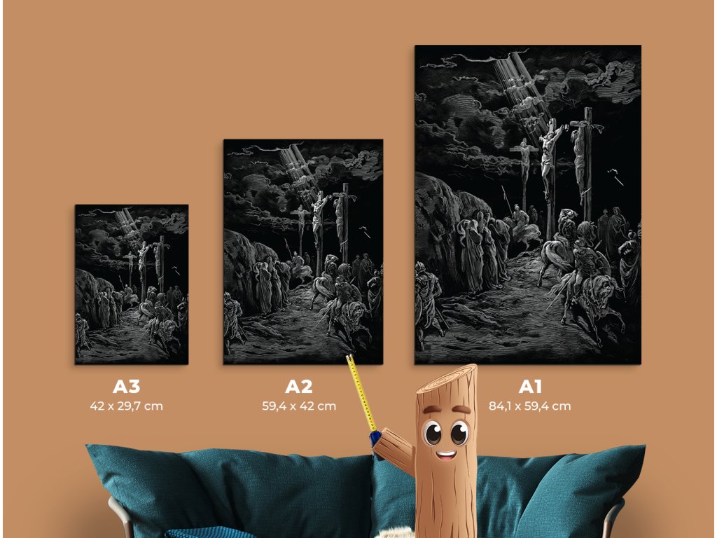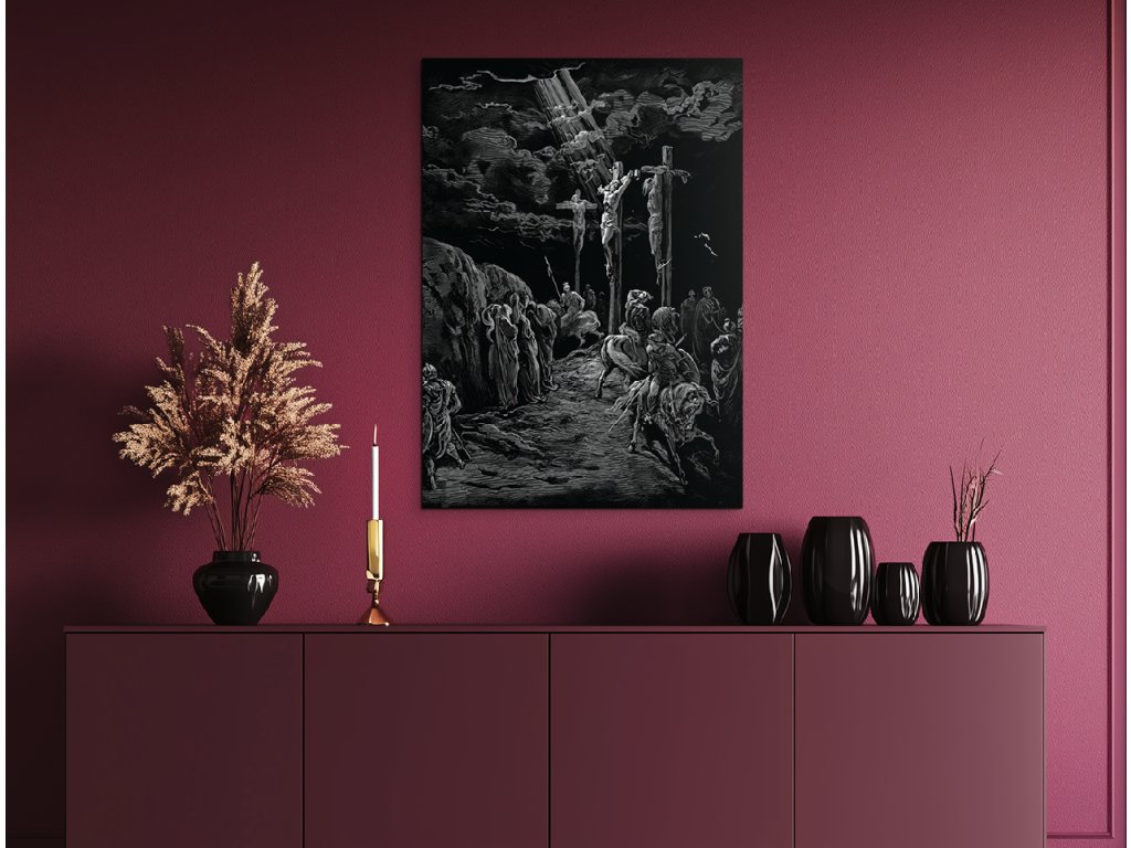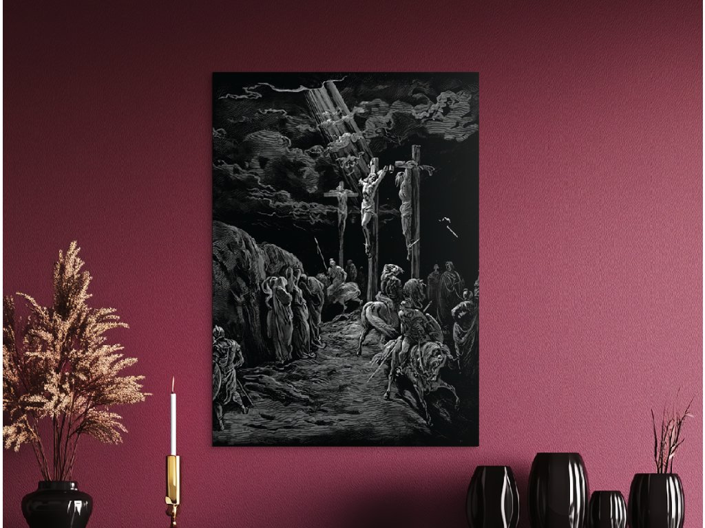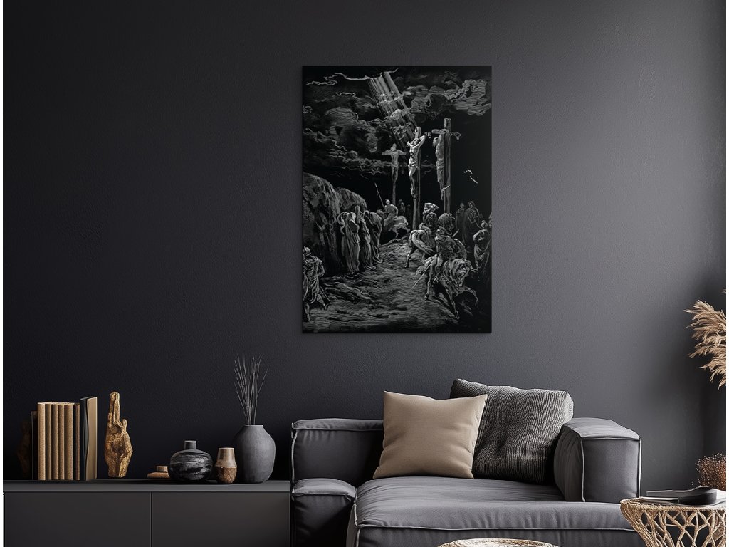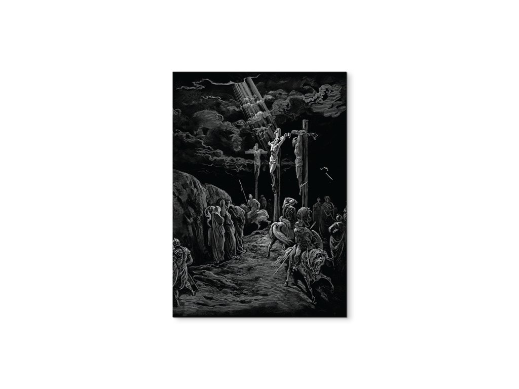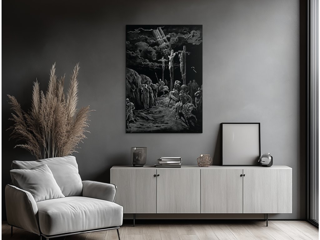 Dramatická scéna ukřižování Ježíše Krista, zachycená v jedinečném stylu Gustava Dorého, známá svou surovou silou, kontrastem světla a temnoty. Monochromatické zobrazení se silným symbolickým přesahem zobrazuje Krista na kříži uprostřed chaosu lidí a vojáků, pod temnou, dramatickou oblohou, která zdůrazňuje duchovní význam a utrpení tohoto momentu.