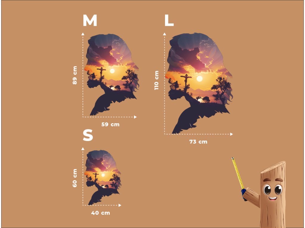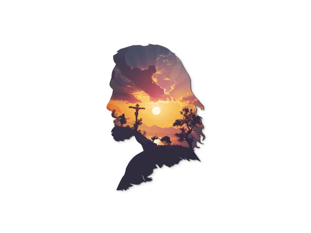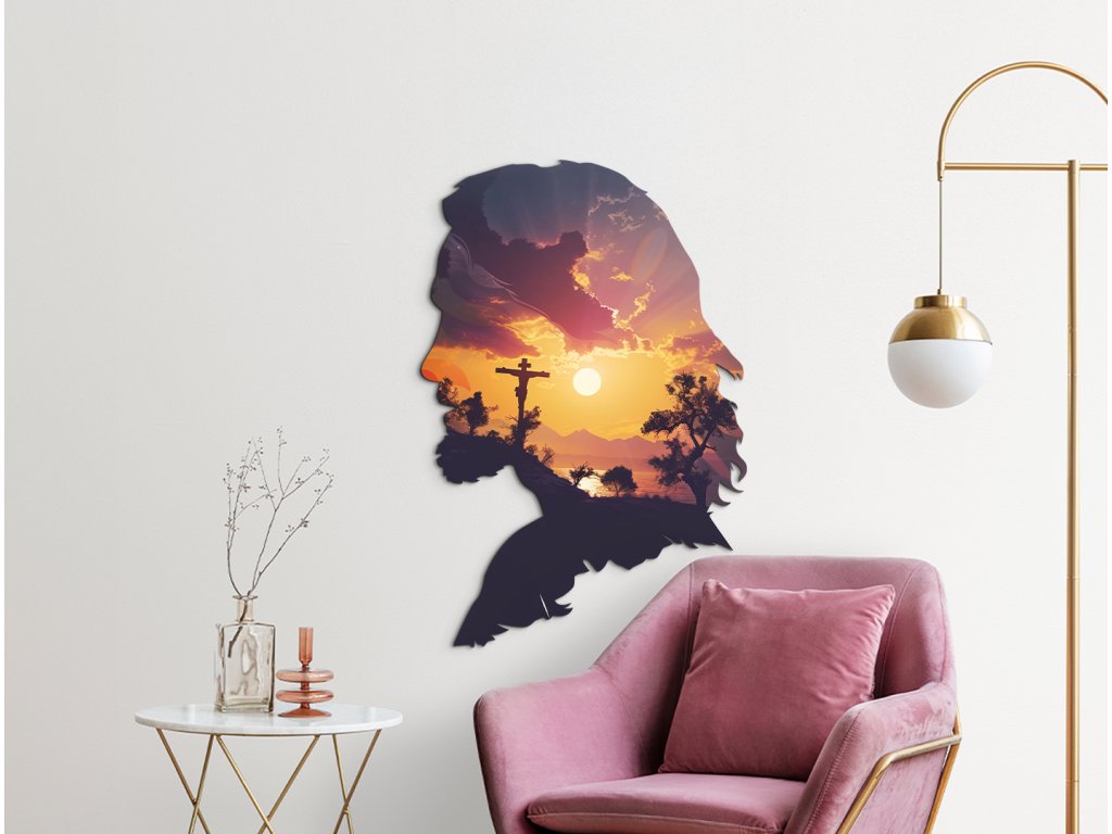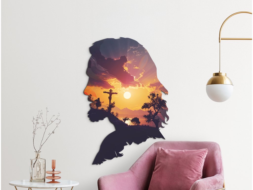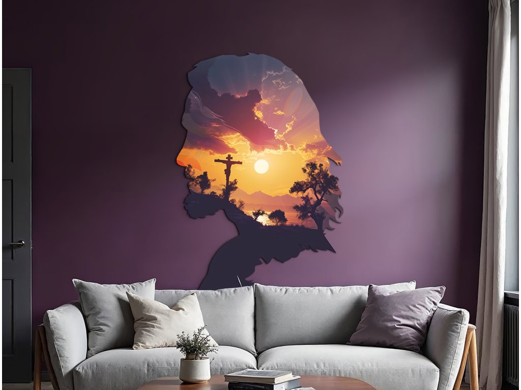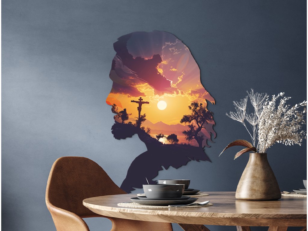 Nástěnný dekor spojuje siluetu tváře Ježíše Krista s dojímavou scénou západu slunce, která se odehrává uvnitř jeho profilu. V záři oranžovo-žlutého slunce se rýsuje Golgota s křížem, obklopená siluetami stromů a kopců. Dílo působí duchovně a symbolicky – jako spojení oběti, víry a naděje ve světle nového dne.