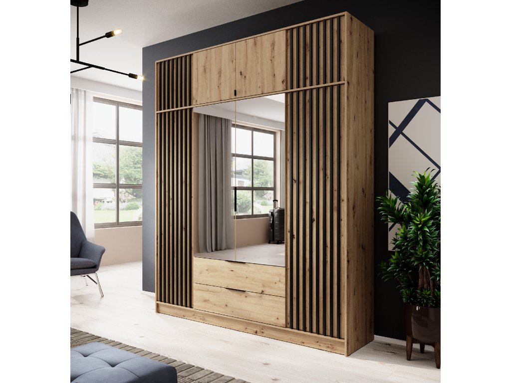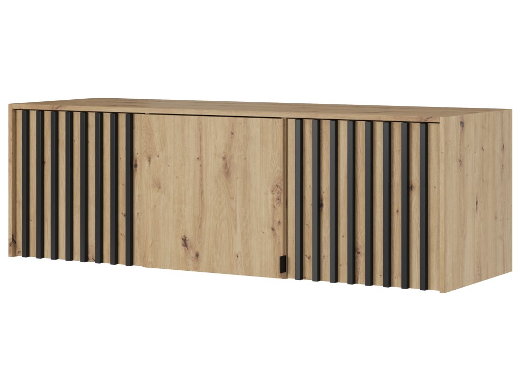 Nástavec Nelly 3D nabízí praktické rozšíření úložného prostoru nad třídveřovou skříní ve stylovém provedení dub artisan s černými lamelami. Díky třem pantovým dvířkům poskytuje prostor pro odložení sezónních věcí a zároveň ladí s designem skříně. Ideální řešení pro efektivní využití výšky místnosti. Spolehlivý doplněk, který spojuje funkčnost a styl.