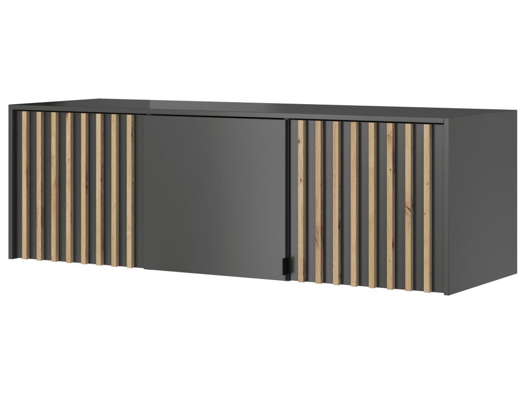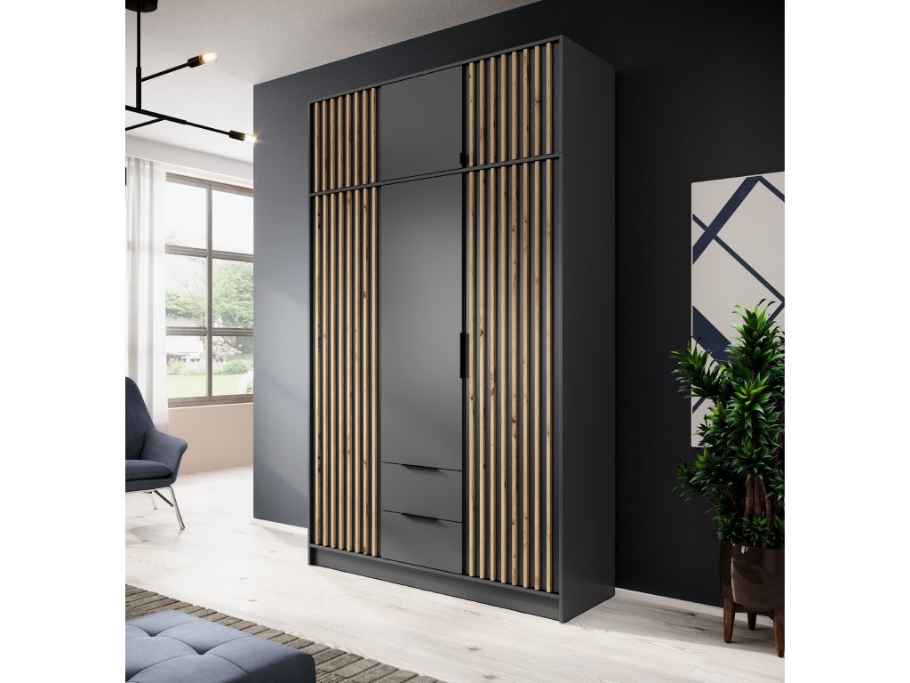 Nástava Nelly 3D v kombinaci grafitové barvy s lamelami v dekoru dub artisan je dokonalým rozšířením třídveřové skříně ze stejné kolekce. Díky identickému designu a proporcím přirozeně navazuje na spodní část skříně, čímž vytváří vizuálně čistý a ucelený celek. Vnitřní prostor za třemi pantovými dvířky je ideální pro uložení sezónních věcí, přikrývek či kufrů, které chcete mít mimo dohled. Vyrobený z kvalitní laminované desky s ABS hranami, s praktickými plastovými černými úchyty, je pevný a připravený pro každodenní používání.