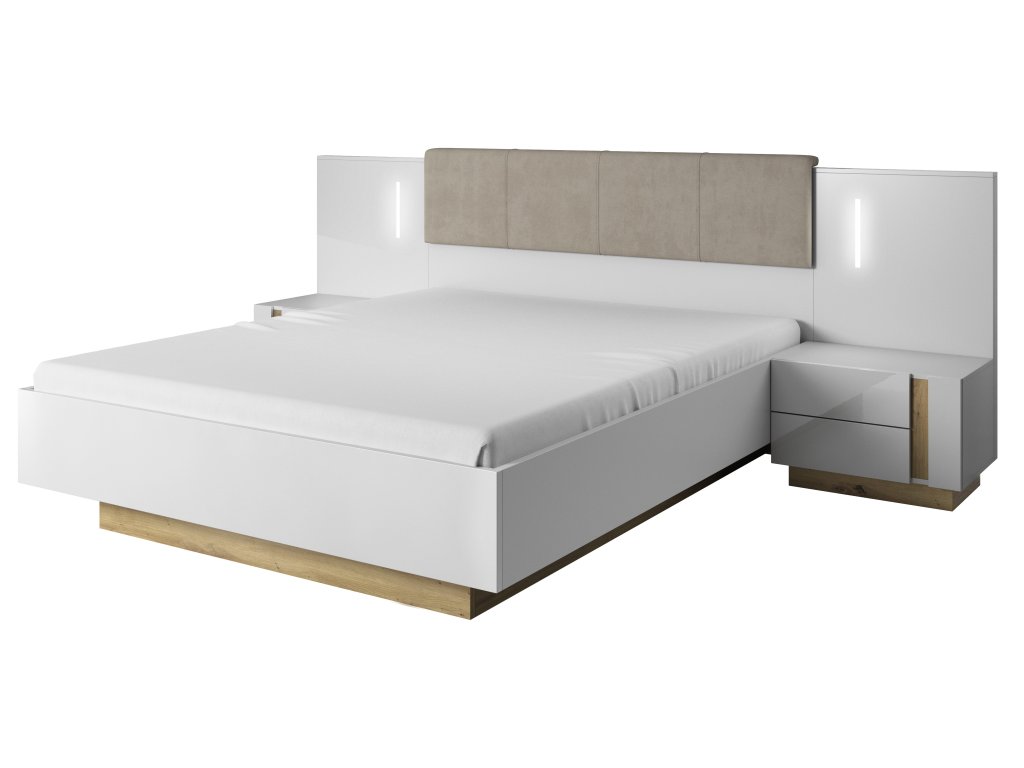 2× noční stolek Arcon – bílý lesk / dub grandson se upevňuje přímo k čelu postele a vytváří dojem jednoho celku. Každý stolek má 2 zásuvky a na vrchu integrované LED osvětlení v ceně, které dodá ložnici moderní a útulný nádech.