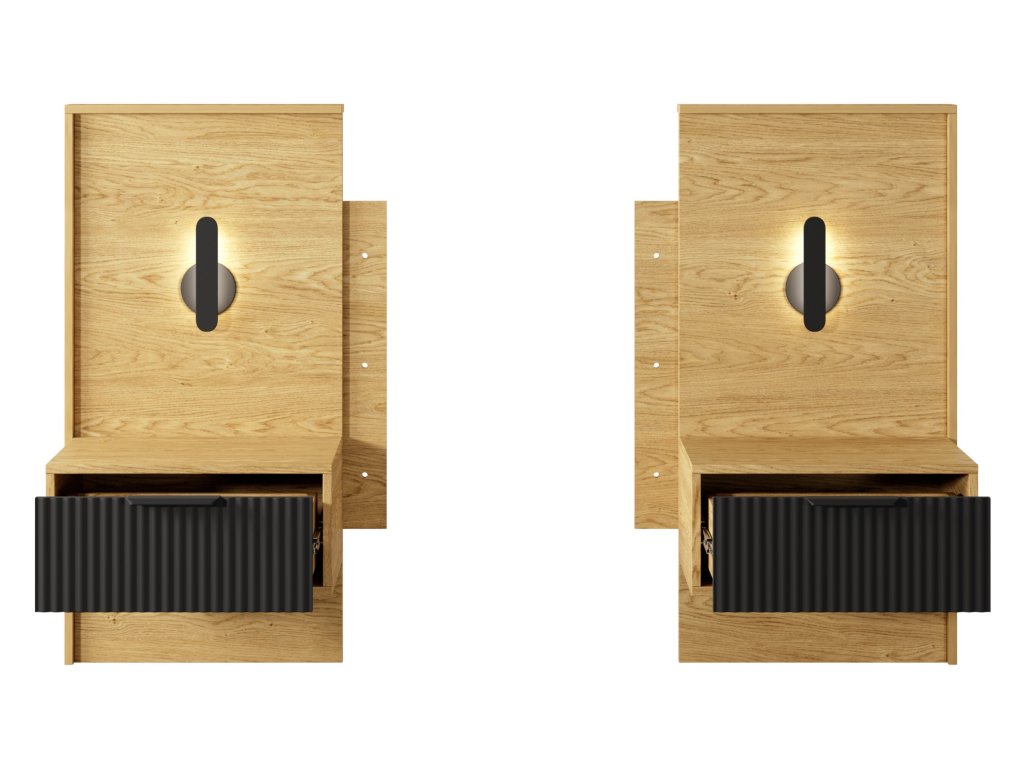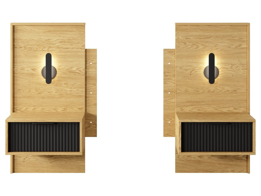 Každý stolek disponuje jednou zásuvkou pro odkládání drobností a integrovaným LED osvětlením v ceně, které jemně osvětlí prostor po bocích postele a dodá ložnici příjemnou atmosféru. Spojení přírodního dřeva a černých detailů zaručuje, že stolky budou nejen funkční, ale také esteticky výrazným prvkem vaší ložnice.