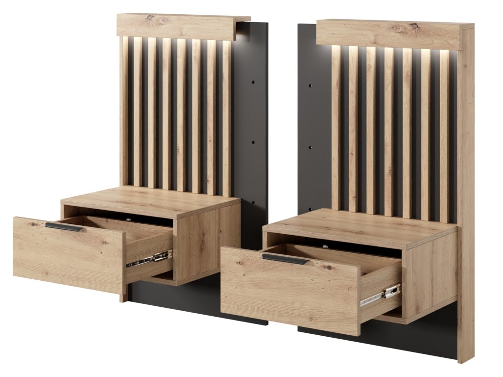 2× noční stolek Tally – dub artisan / antracit o rozměrech 50,4 × 36,6 × 102 cm nabízí praktickou zásuvku. Elegantní kontrast antracitového čela s dubovými lamelami dodá ložnici moderní a útulný charakter.