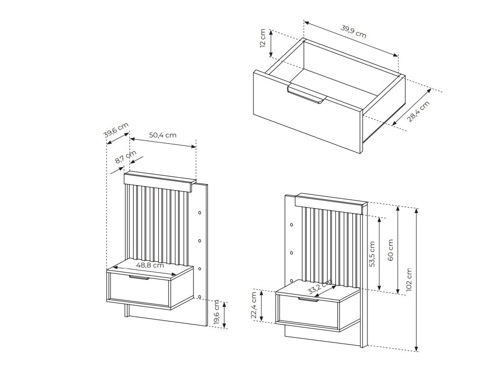 Noční stolky Tally jsou navrženy tak, aby vytvořily s postelou z kolekce Tally harmonický a funkční celek. V balení se nacházejí dva stolky (levý a pravý), které se jednoduše připojí k čelu postele. Každý stolek má rozměry 50,4 × 36,6 × 102 cm (vrchní deska stolku je ve výšce 42 cm) a svým designem kombinuje antracitové čelo ozdobené vertikálními dubovými lamelami.