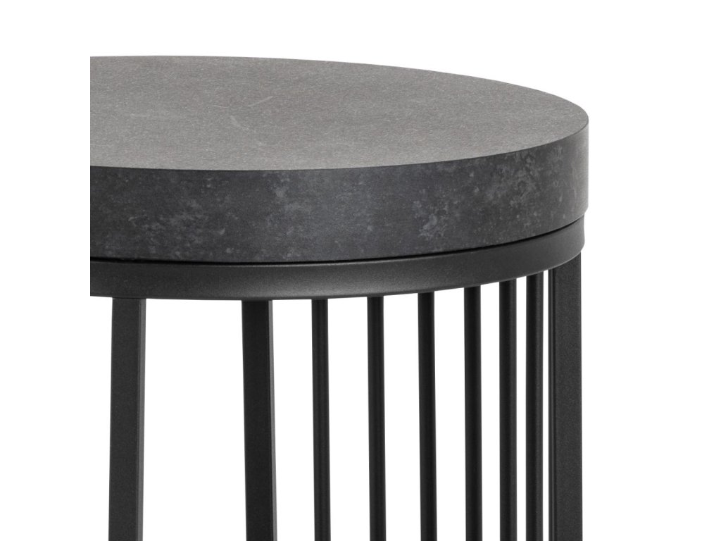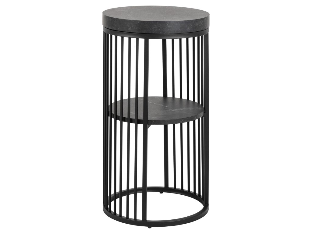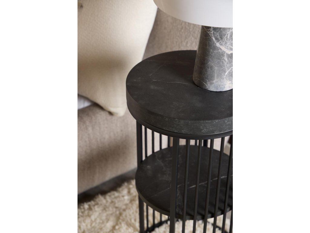 Kulatý noční stolek Strington zaujme již na první pohled svou architektonickou formou, která připomíná sloup současné moderní architektury. Jeho vrchní deska a police s černým mramorovým vzhledem působí sofistikovaně, zatímco svislé dráty drátěného rámu vytvářejí iluzi objemu, ale zároveň ponechávají stolek vizuálně lehkým. Tento výrazný designový kousek je ideální jako noční stolek do ložnice, ale díky své výšce a eleganci poslouží také jako příruční stolek v obýváku či hale.