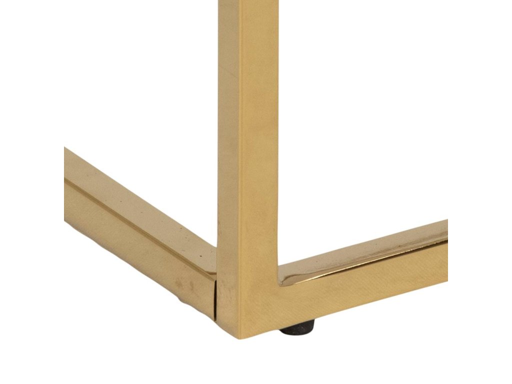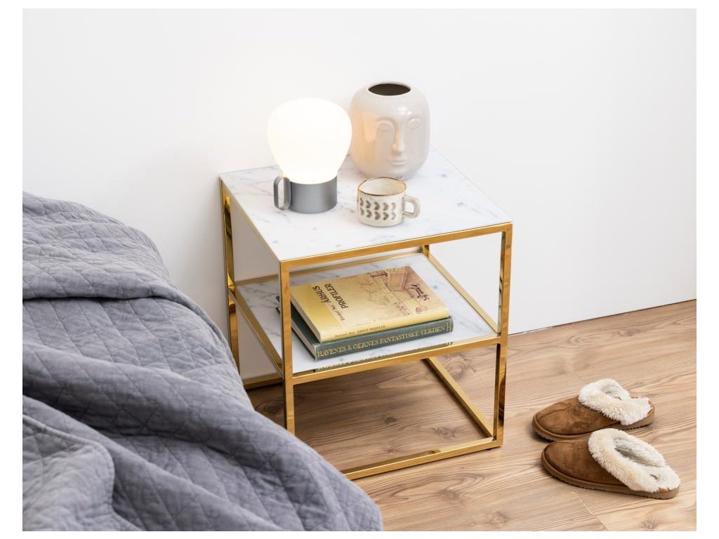 Jeho rozměry 45 × 40 × 50,5 cm nabízejí vyvážený poměr mezi kompaktností a praktickým úložným prostorem. Dolní police poskytuje místo pro knihy a drobnosti, zatímco 4 stabilní nohy ve zlatém chromu dodávají pevnost a luxusní výraz. Povrchy se snadno čistí – stačí čistič na sklo a hadřík z mikrovlákna.