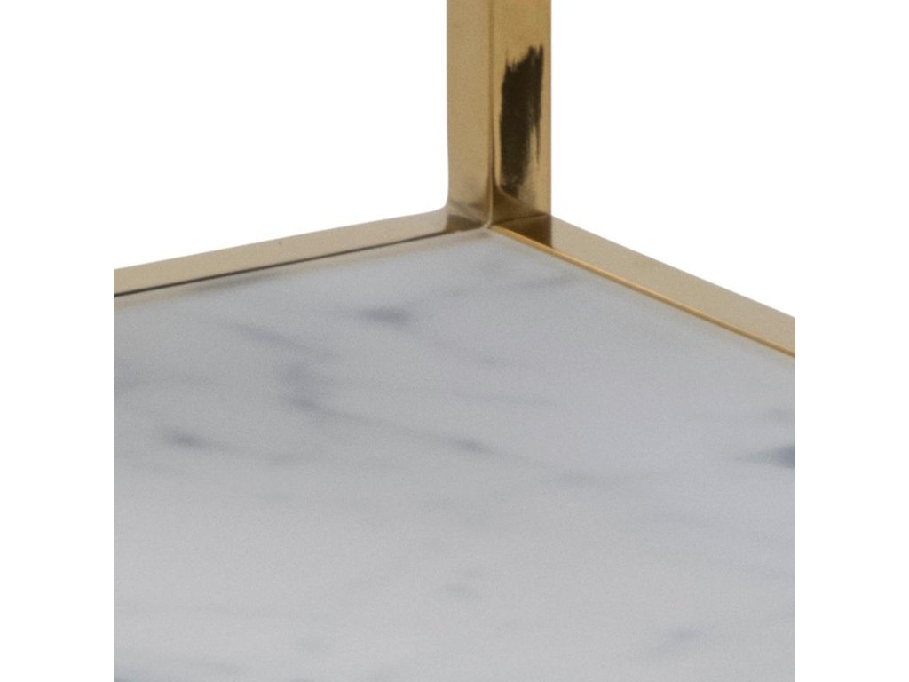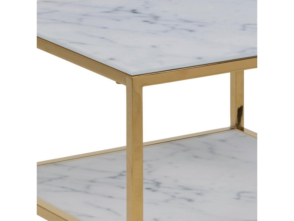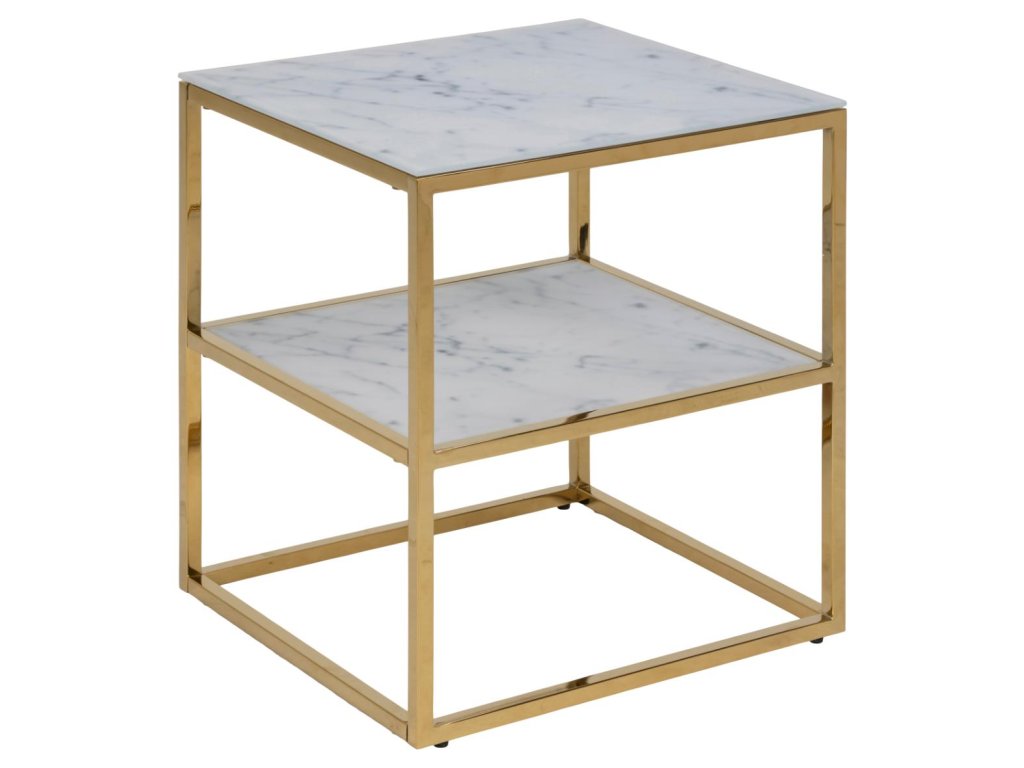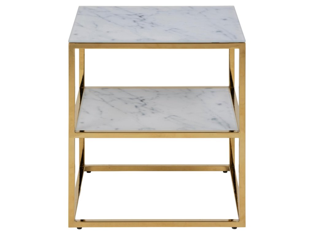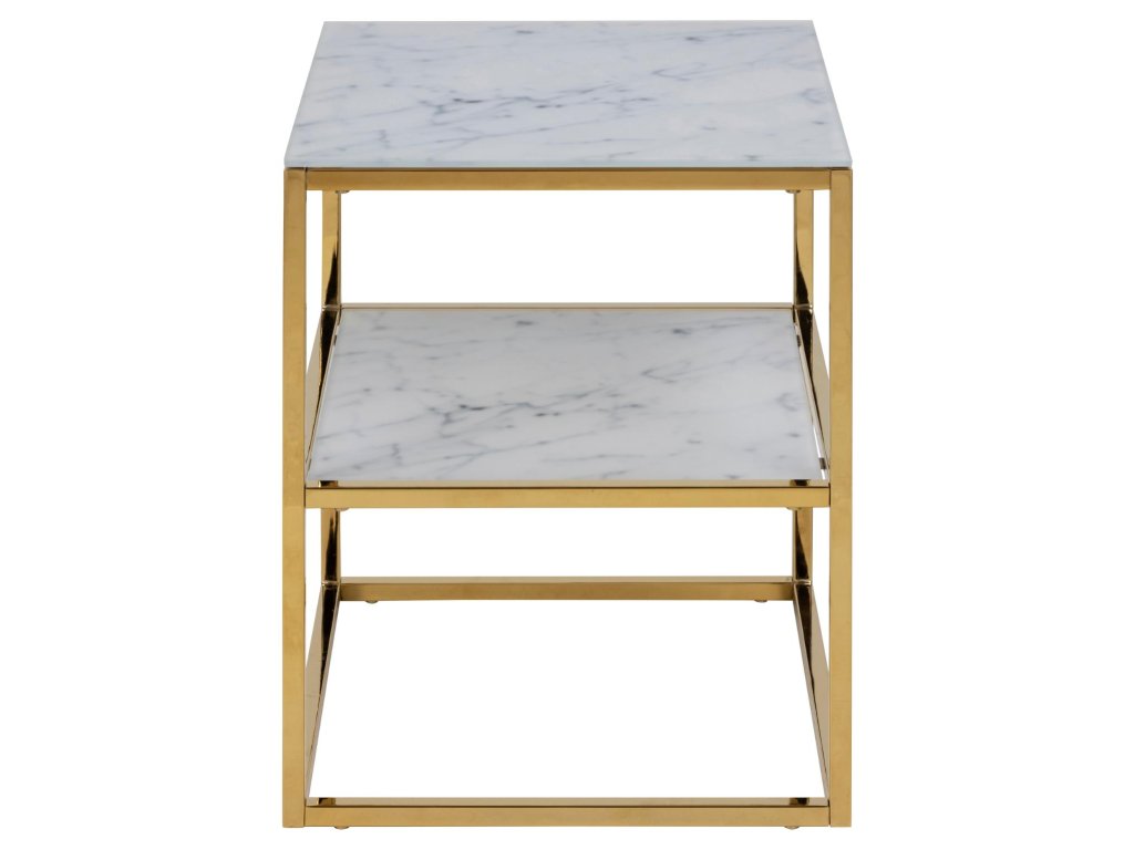 Luxusní noční stolek Alisma v rozměru 45 × 40 × 50,5 cm s deskou a policí z bílého křišťálového mramoru Rome. Zlatá chromová podnož, moderní vzhled, praktická úložná police a snadná údržba.