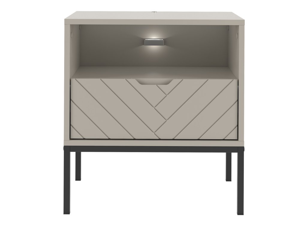 Noční stolek Aspen 04 v matné béžové barvě přináší do ložnice jemnost a harmonii. Čelo šuplíku zdobí elegantní frézovaný stromkový vzor, který spolu s minimalistickým bezúchytkovým designem vytváří moderní vzhled. Zásuvka s plným výsuvem a otevřená polička nad ní poskytují praktický prostor pro věci, které potřebujete mít vždy po ruce.