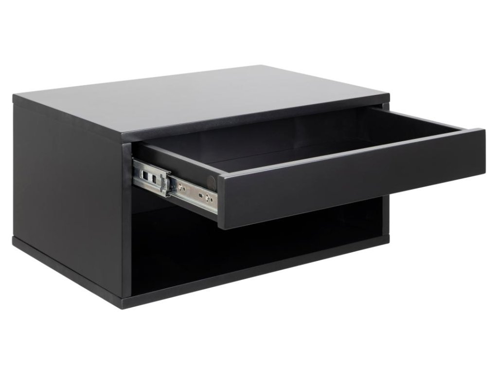 Noční stolek Cholet v černé barvě nabízí praktické řešení pro vaši ložnici. Elegantní matný design s UV lakovanou povrchovou úpravou působí moderně a vkusně. Zásuvka s plným výsuvem a otevřená přihrádka poskytují dostatek prostoru pro uložení drobností. Díky montáži na zeď působí snadno a šetří místo.