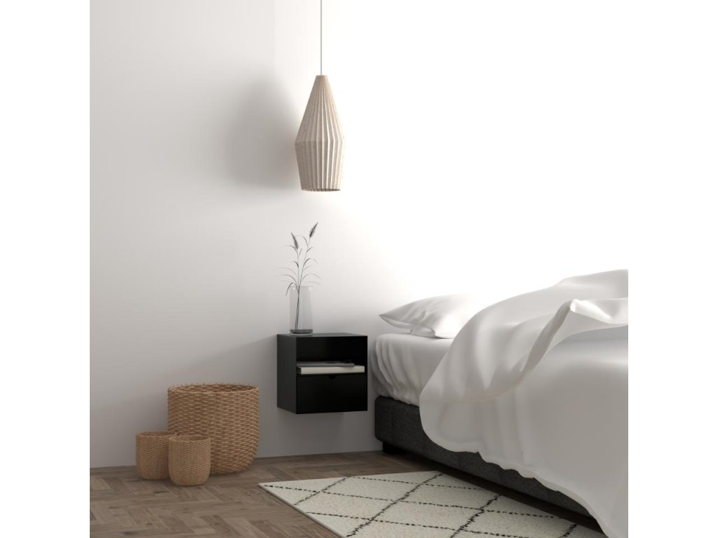 Noční stolek Joliet má kompaktní obdélníkový tvar a černý design. Otevřená přihrádka a zásuvka nabízí praktický úložný prostor. Možnost montáže na zeď šetří místo. Vhodný do moderních a industriálních ložnic.