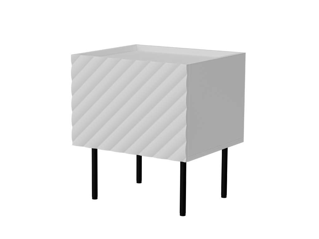 Čelá stolku jsou vyrobena z MDF desky s diagonálním oblým frézováním, které tvoří decentní reliéf a dodává hloubku. Otevírání zajišťuje prakticky vystupující čelo bez potřeby úchytek, což působí čistě a funkčně. Stolek stojí na černých kovových nožičkách o výšce 20 cm, díky čemuž působí vzdušně. K dispozici jsou tři barevná provedení – bílá, černá a béžová, aby ladil do jakéhokoli stylu ložnice.
