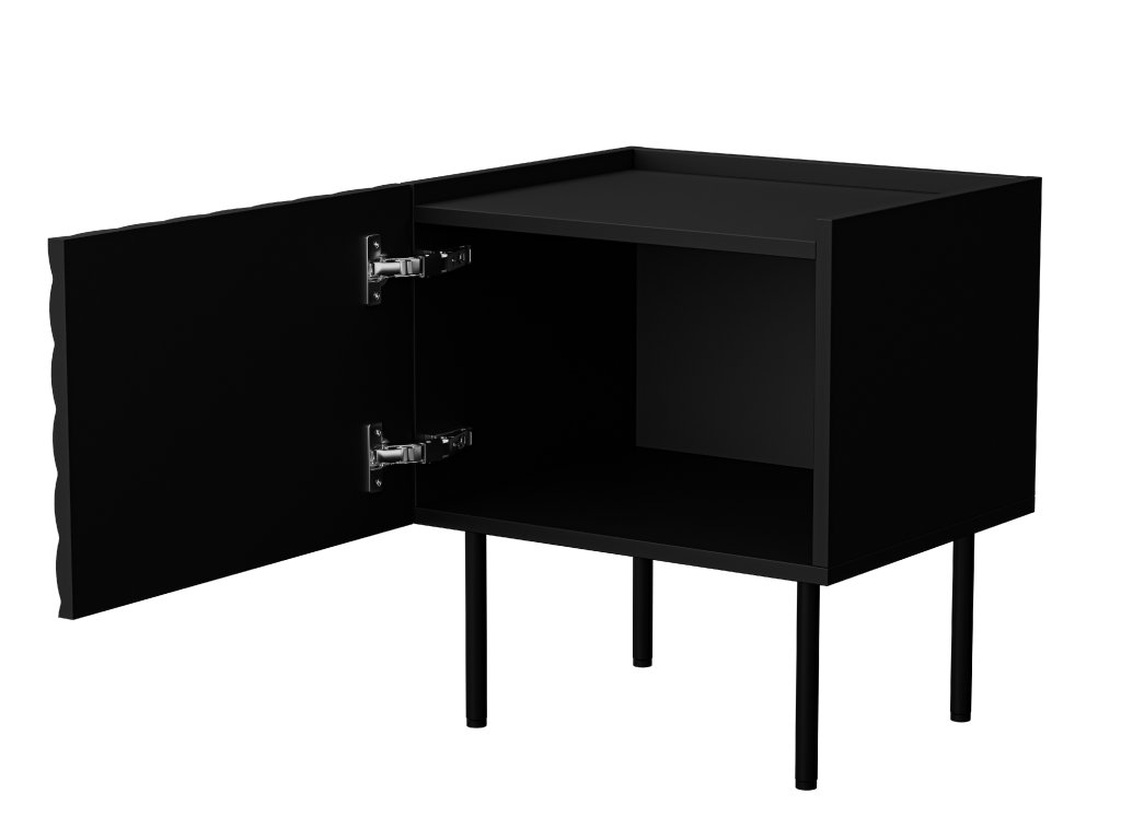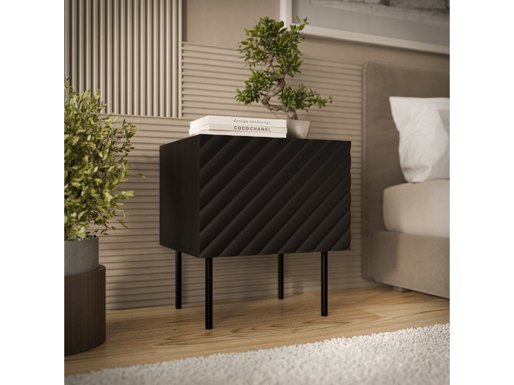 Černý noční stolek Lucia přináší do ložnice sofistikovaný vzhled s jemným kontrastem. Výrazné diagonální linie čel vyniknou v tmavém provedení a dodají charakter i malému kousku nábytku. Dvířka otevíraná bez úchytek působí moderně a čistě. Vhodný k čalouněným i dřevěným postelím.