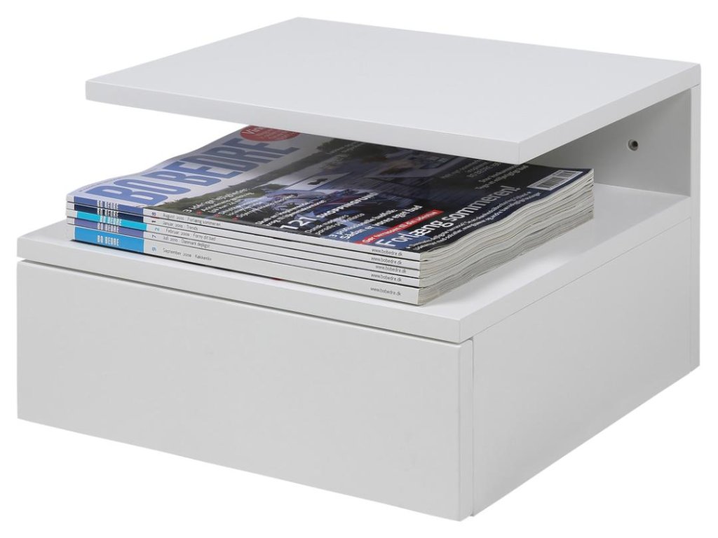 Praktický bílý stolek Ashlan se montuje přímo na zeď. Čistý design se hodí do každého stylu ložnice. Obsahuje zásuvku a otevřenou přihrádku pro vaše drobnosti. Výborný doplněk pro minimalistické interiéry.