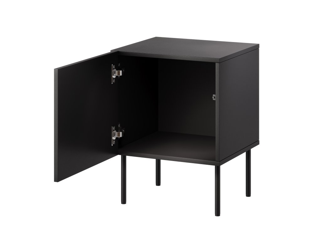 Noční stolek Siena ve výrazné černé barvě je ideálním doplňkem do útulné ložnice s moderním nádechem. Jeho čisté linie a minimalistický design dokonale zapadnou do jakéhokoli interiéru, zatímco za dvířky nabízí praktický úložný prostor na drobnosti. Tento stolek svým jednoduchým, ale elegantním vzhledem nenápadně doplňuje atmosféru klidu a pohodlí, čímž dotváří harmonický celek vaší ložnice.