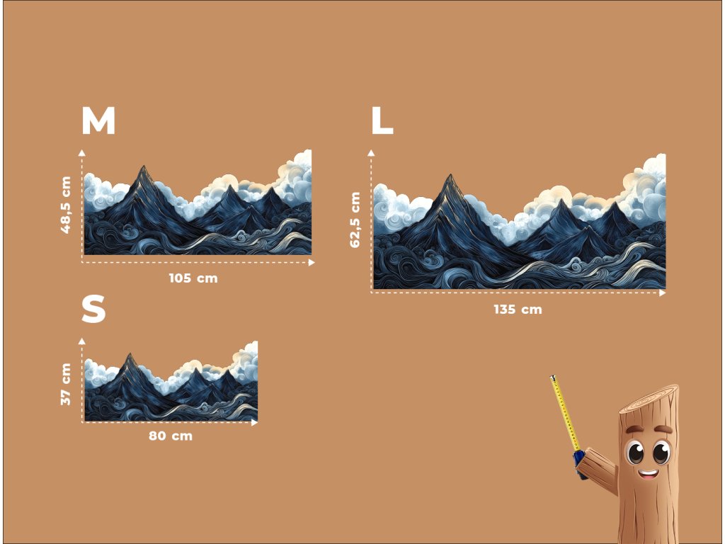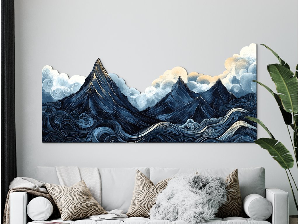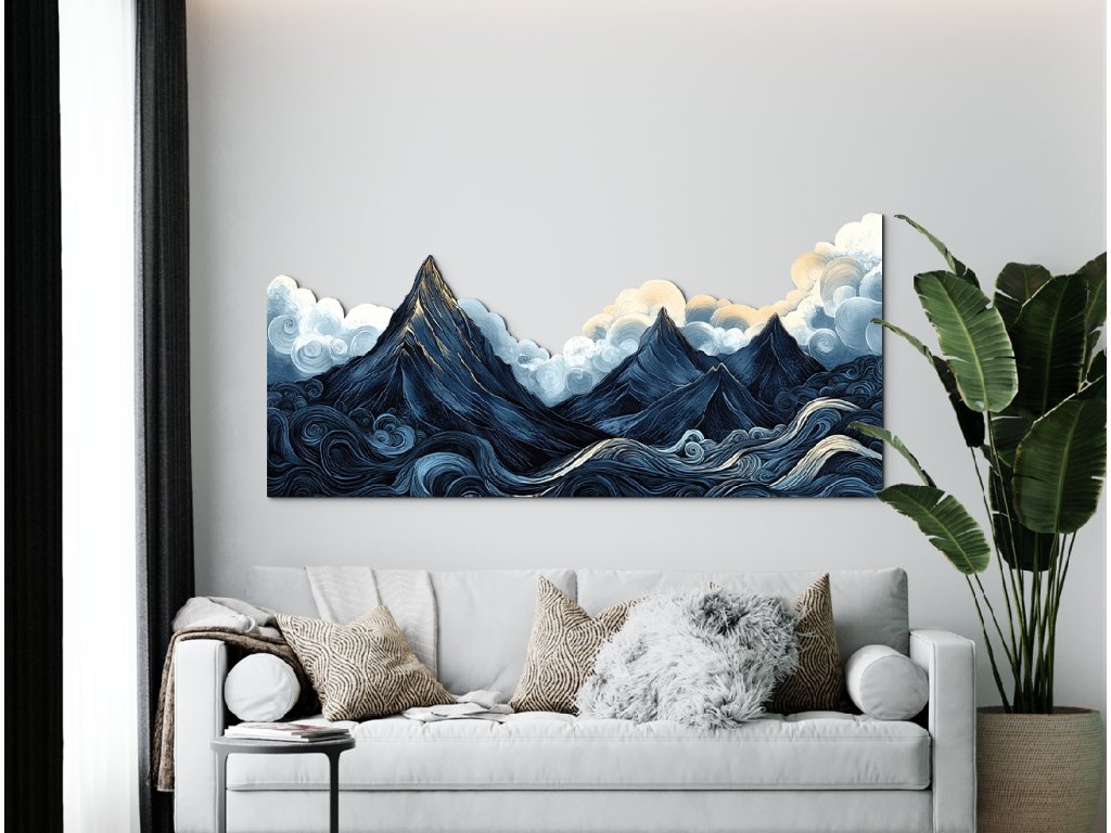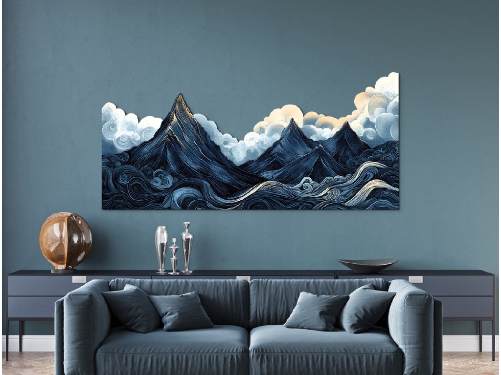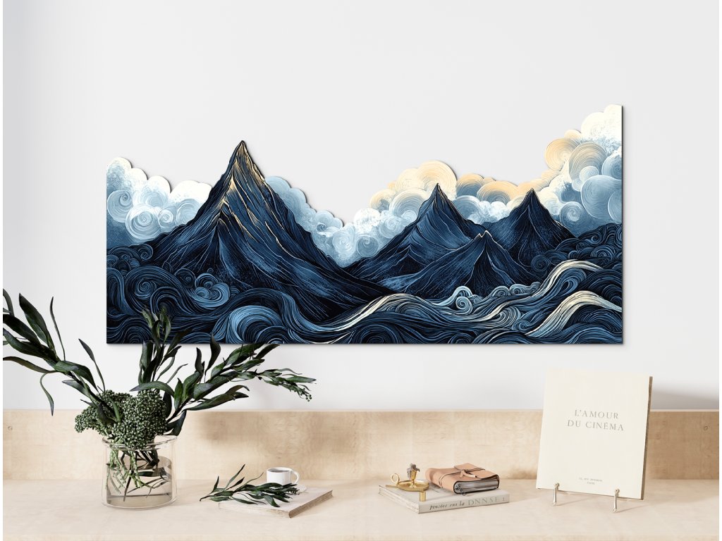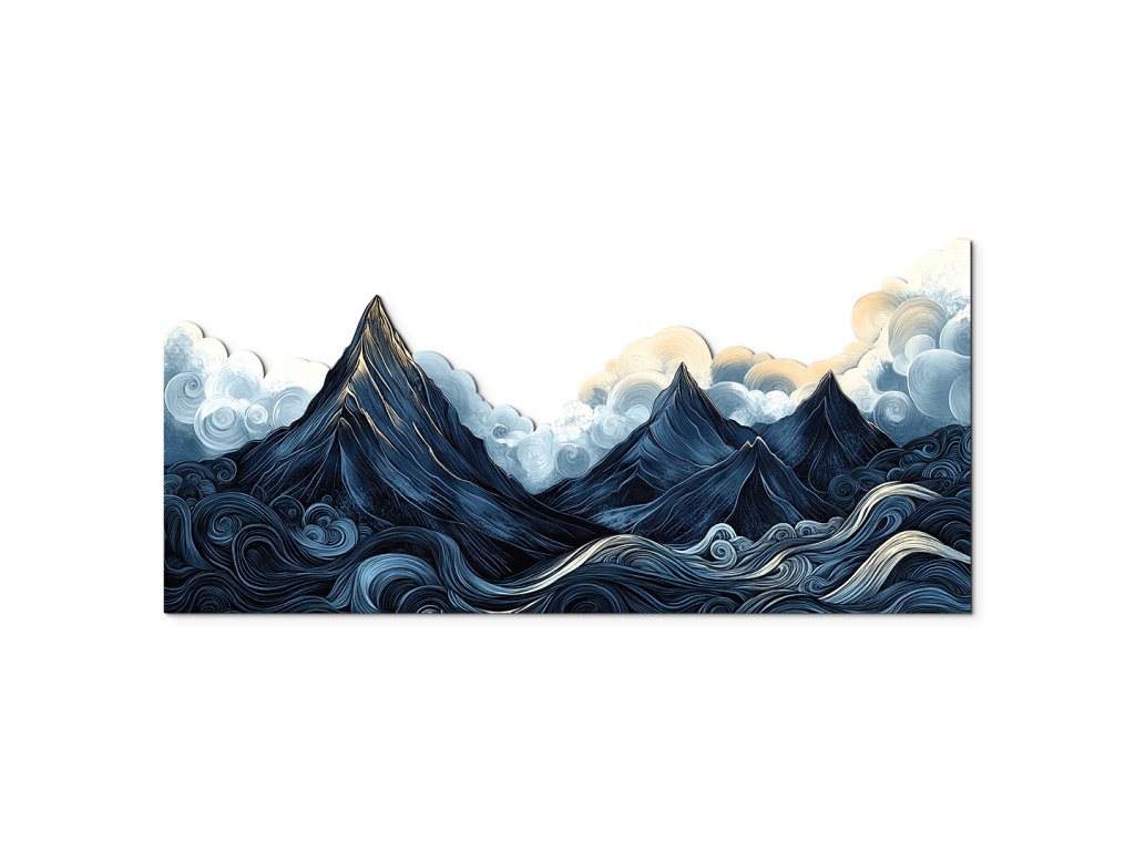 Stylizovaná krajina zachycuje dramatickou scenérii ostrých tmavých hor pod těžkou, oblačnou oblohou, zatímco vlnité, vířící vody v popředí dodávají kompozici pohyb a energii. Měkké, zaoblené tvary mraků kontrastují s ostrými liniemi hor, čímž vytvářejí snový, umělecký dojem. Tmavě modrá a šedá paleta je oživena jemným zábleskem žluto-oranžového světla na vrcholech – jako náznak naděje uprostřed přicházející bouře.