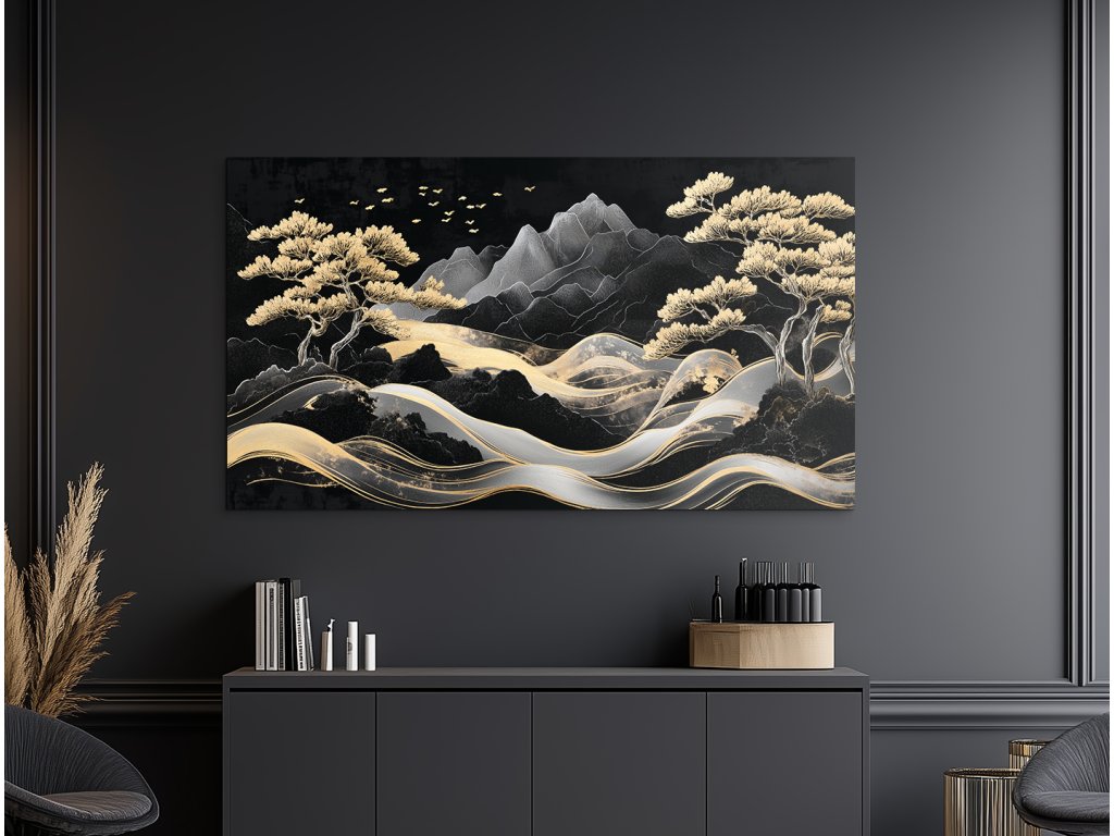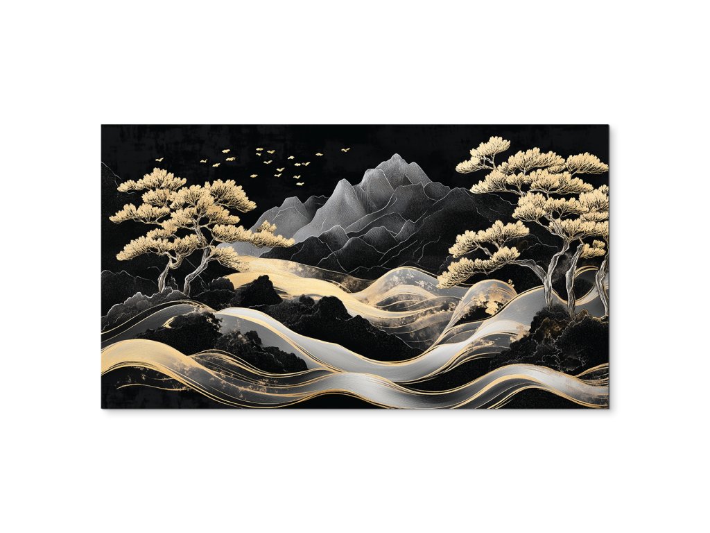 Obraz zachycuje harmonickou horskou scenérii s elegantními, zlatými stromy a vlnivou cestou či řekou, která vede středem kompozice. Stylizované tmavé hory v pozadí spolu s letícími ptáky vytvářejí klidný a ušlechtilý vizuální zážitek s nádechem asijské estetiky.