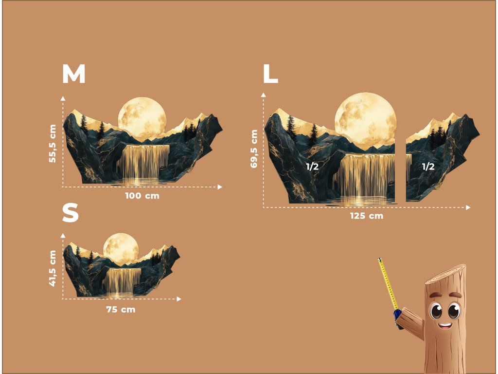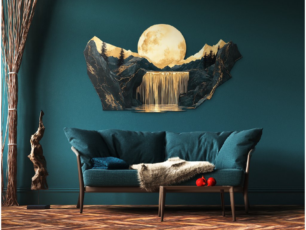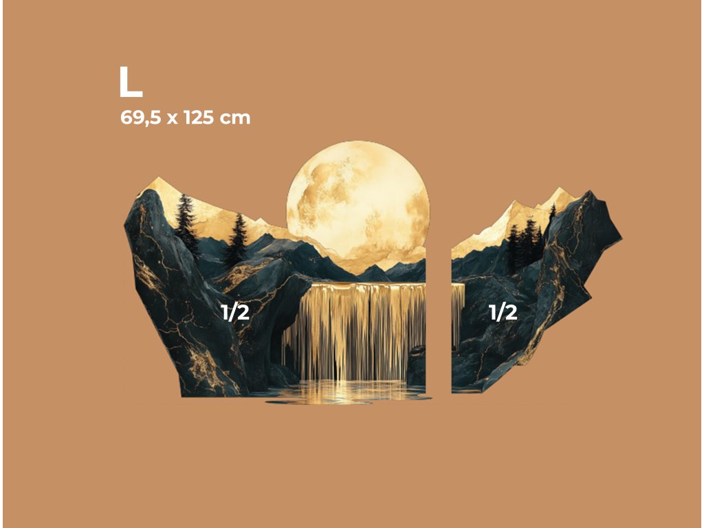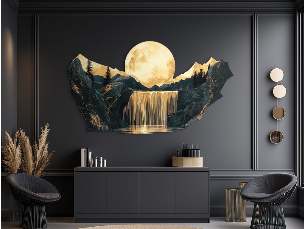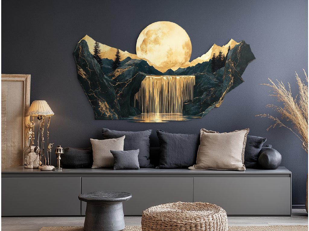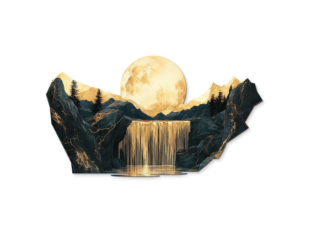 Toto abstraktní dílo připomíná stylizovanou krajinu s tmavými horskými tvary a velkým zářivým kotoučem, evokujícím slunce nebo měsíc. Pod ním se kaskádovitě spouští zlatý prvek, připomínající vodopád světla nebo přesýpající se písek času, což dodává obrazu snovou a symbolickou hloubku.