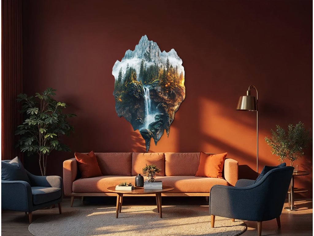 Horská krajina se vznáší v prostoru jako utržený kus světa, ze kterého vyvěrá zářivý pramen vody a světla. Vodopád stéká z výšek mezi lesy a skalami, obklopený světelnými body připomínajícími magické jiskry. Dílo spojuje sílu přírody s éterickým klidem a vytváří dojem, že hory samy jsou zdrojem života i tajemna.