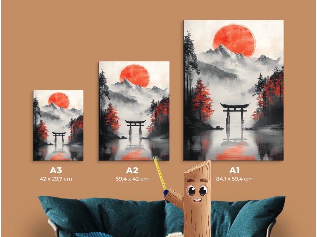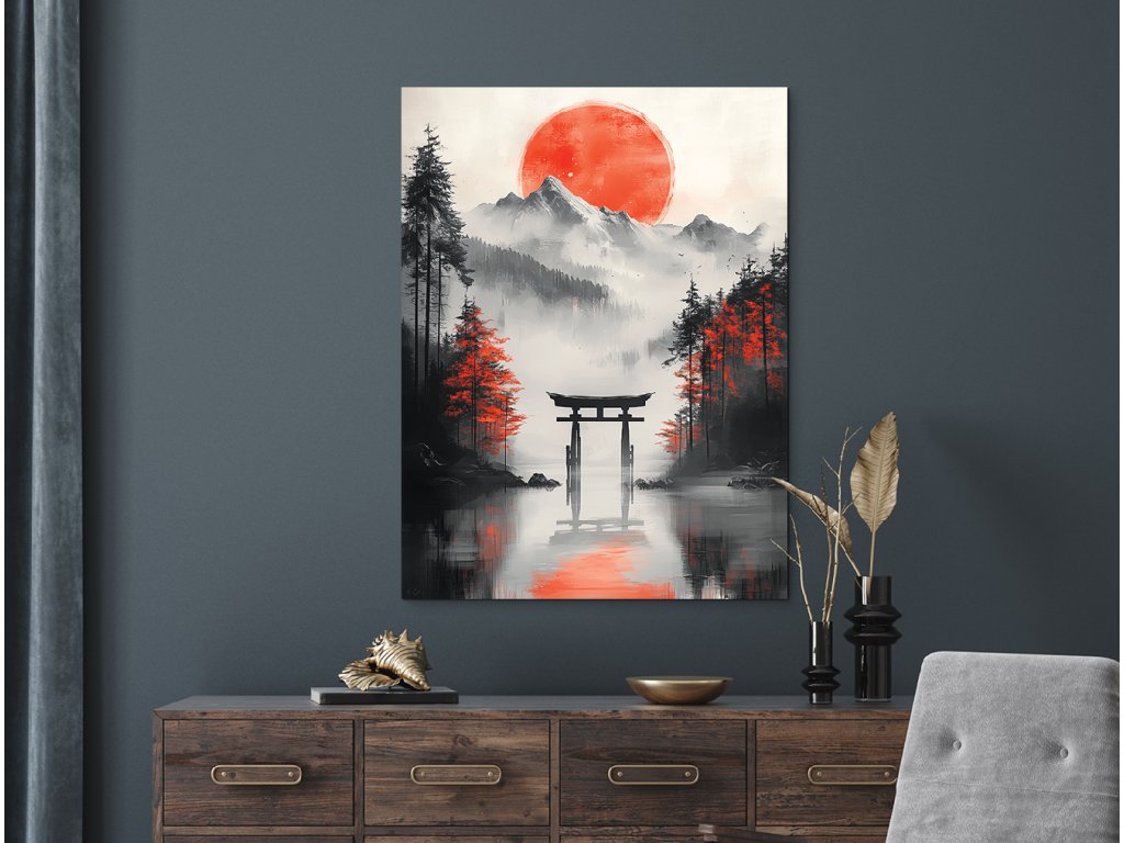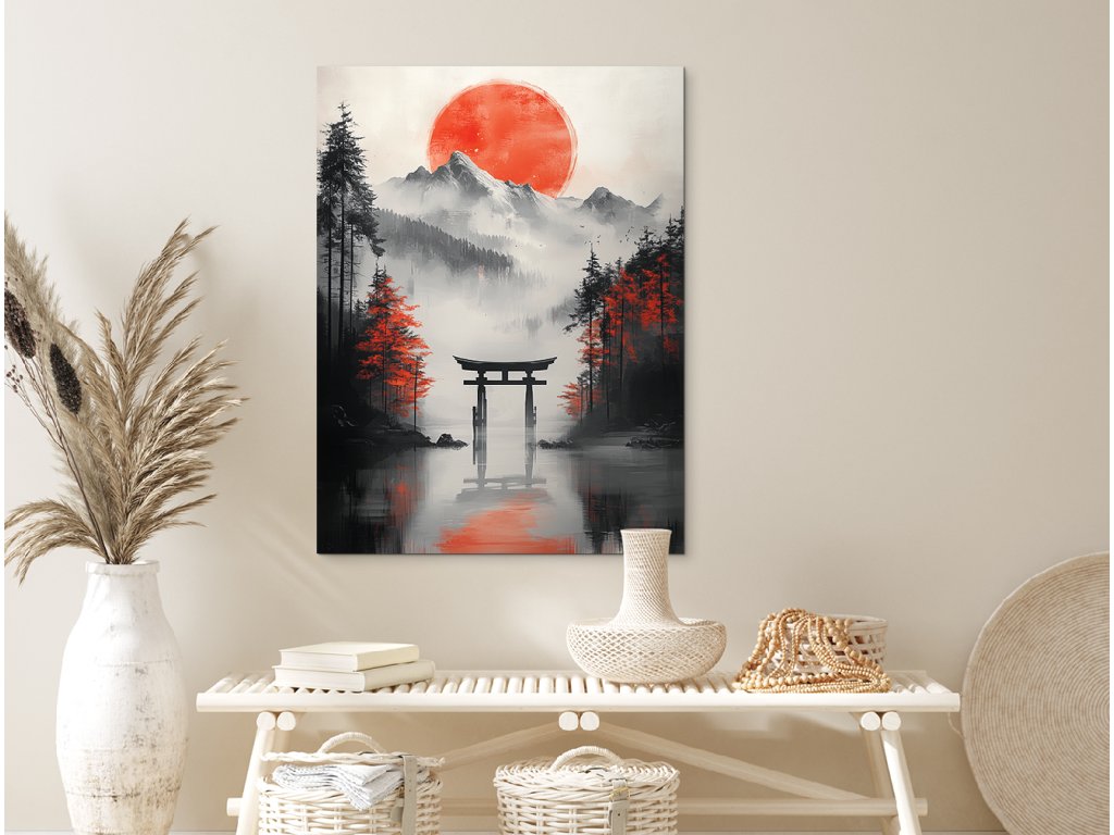 Obraz zachycuje japonskou bránu Torii, stojící osaměle v zemi nebo nad vodou, jako symbol přechodu do duchovního světa. Její červená konstrukce s černými prvky vyniká na klidném pozadí, čímž zdůrazňuje její rituální význam a estetickou sílu. Dílo působí harmonicky a meditativně, ideální na místa, kde se hledá klid a duchovní rovnováha.
