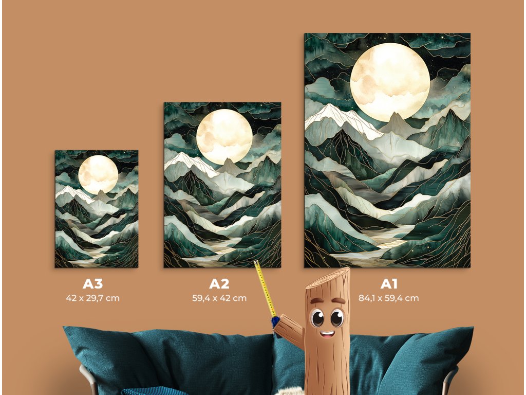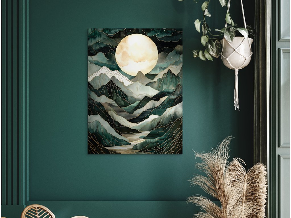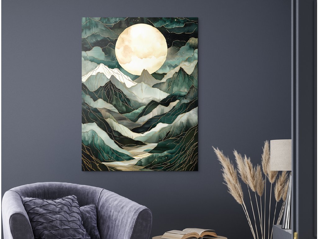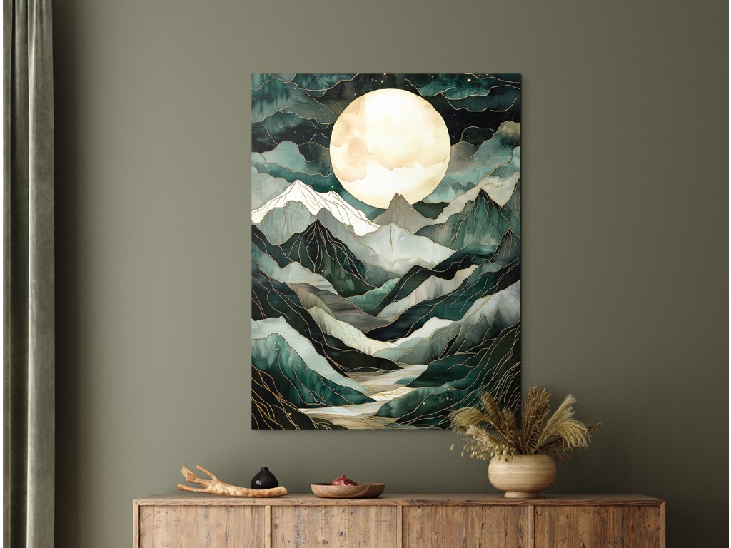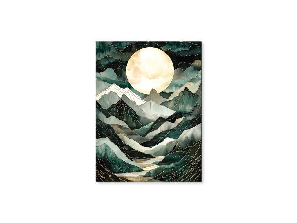 Jemně abstraktní obraz, který zobrazuje tichou noční krajinu s horskými siluetami, klidnou řekou a velkým svítícím měsícem. Moderní styl a jemné kontrasty barev dodávají obrazu klidnou a zasněnou atmosféru, ideální pro vytvoření harmonie v interiéru.