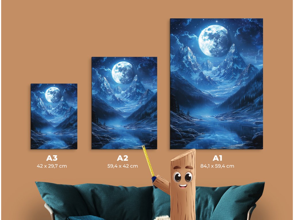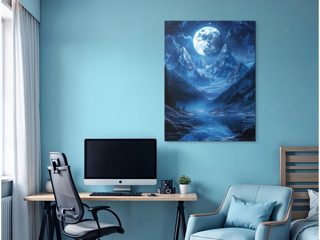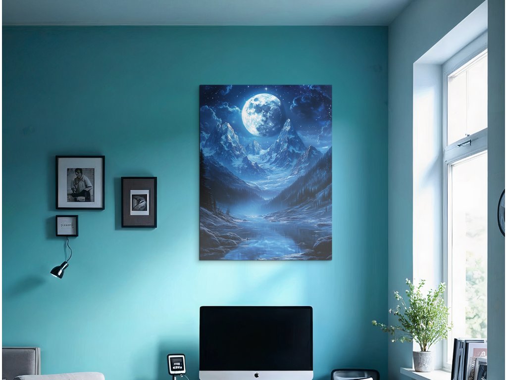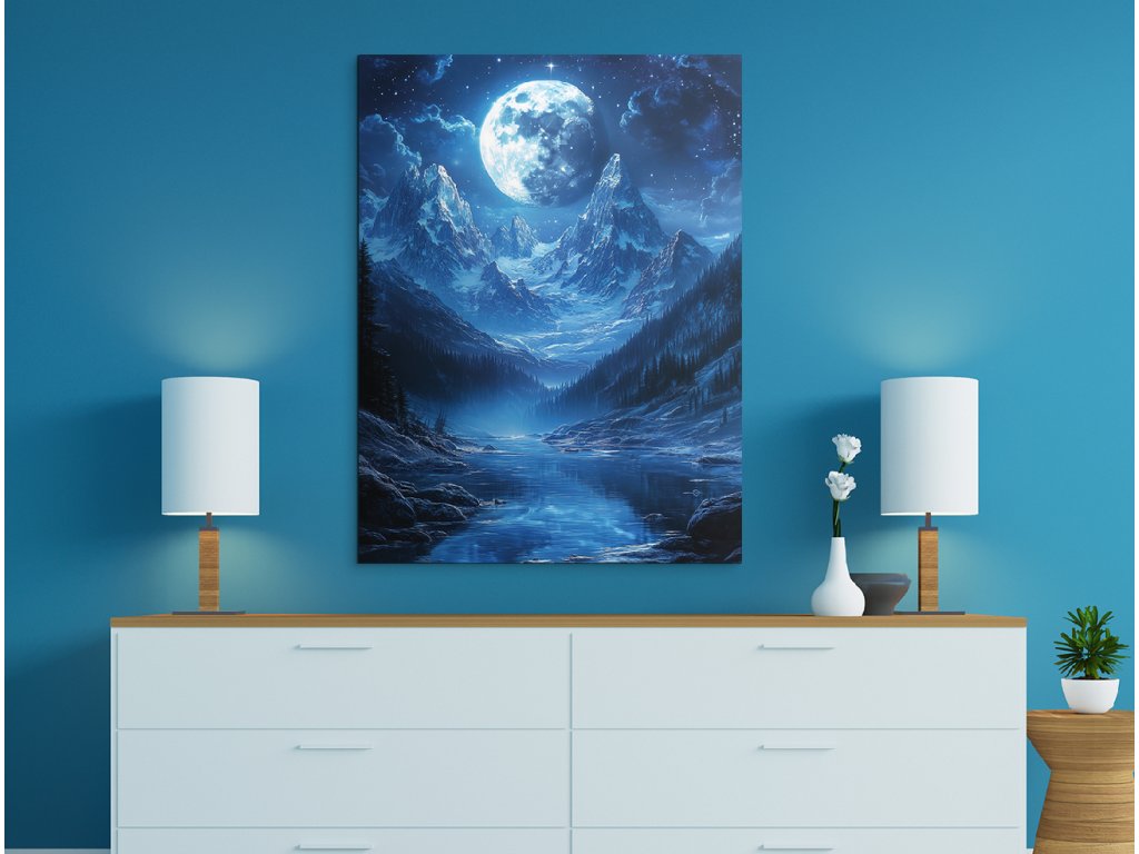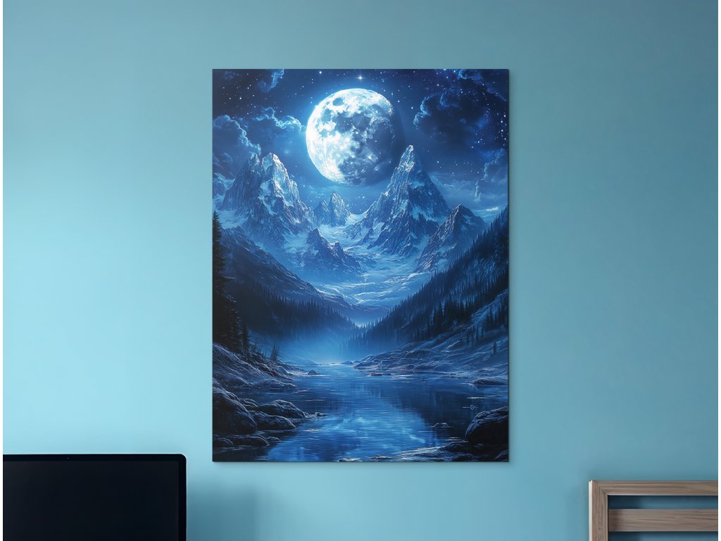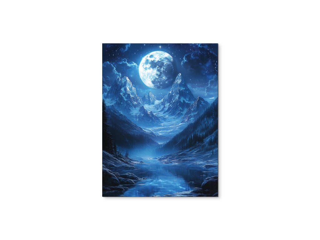 Umělecké dílo zachycuje působivou noční scénu s plným měsícem zářícím nad zasněženou horskou krajinou. V údolí se zrcadlí jezero nebo řeka, což umocňuje klid a hloubku kompozice. Atmosféra obrazu vyzařuje tajemství a vnitřní klid, typický pro magickou sílu úplňku.