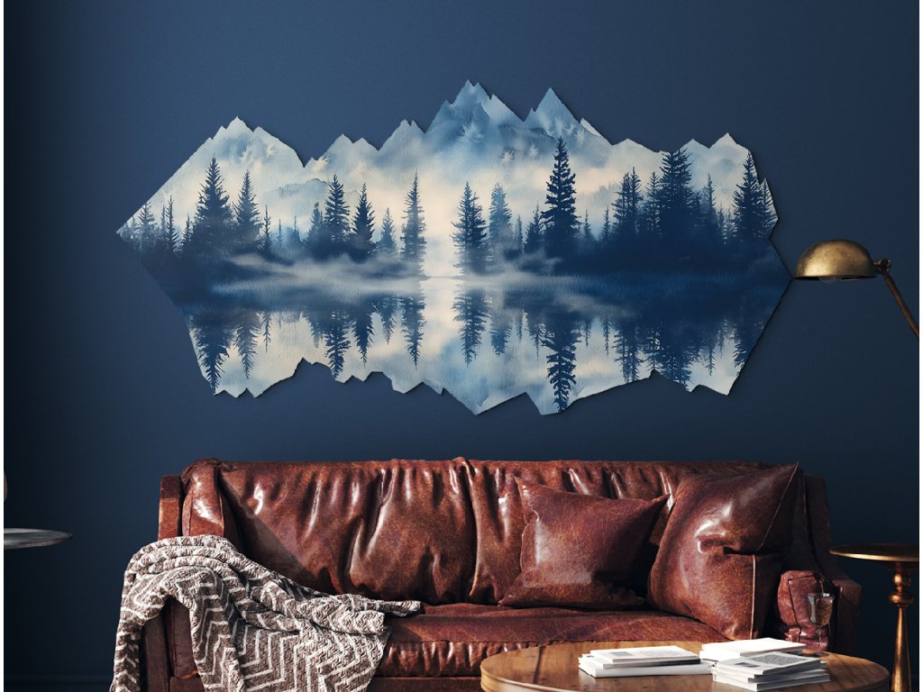 Umělecké dílo zobrazuje klidnou horskou krajinu se zrcadlovým odrazem lesa a štítů v jezeře. Mlha a chladné modré tóny navozují mystickou, tichou atmosféru, která působí uklidňujícím dojmem. Netypický tvar obrazu, kopírující siluetu přírody, z něj činí nápaditý a moderní interiérový doplněk.