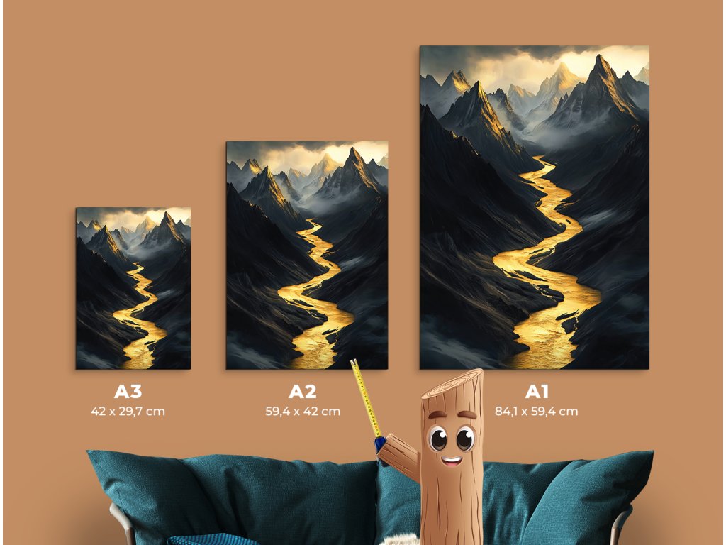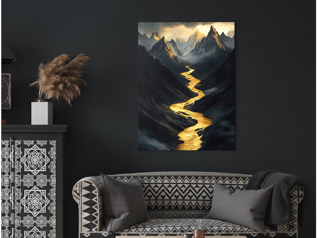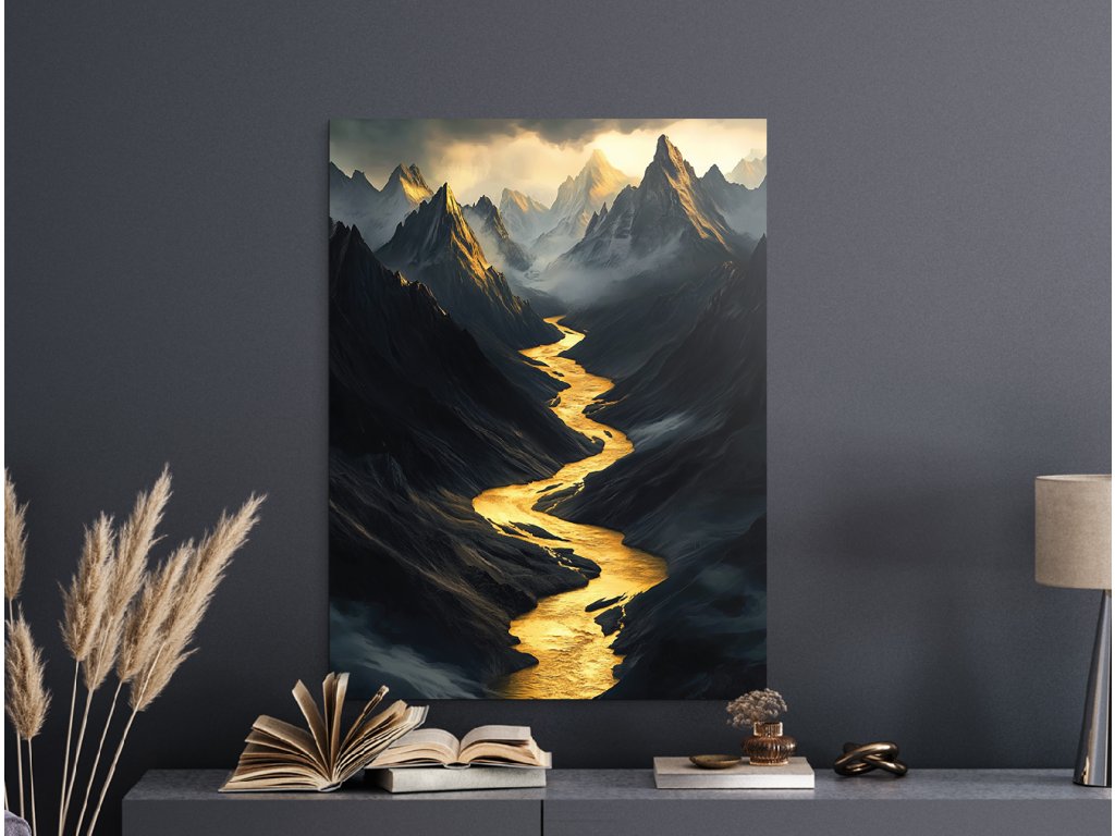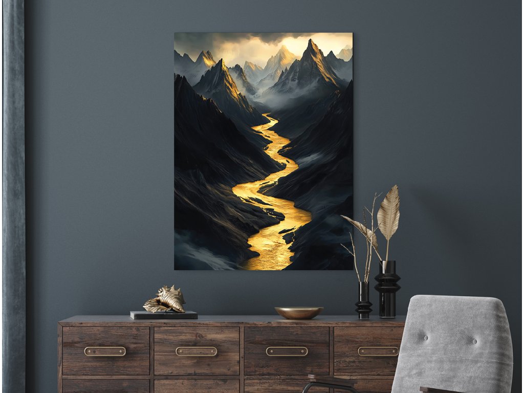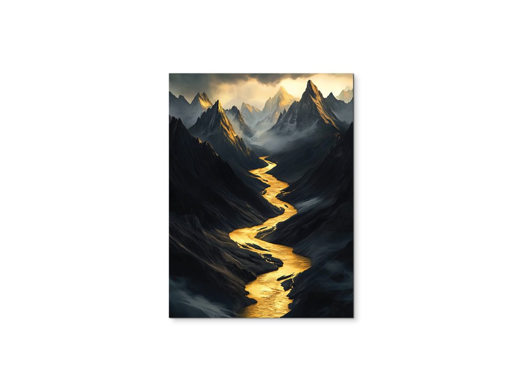Obraz zachycuje temnou horskou krajinu protínanou zářivě zlatou řekou, která se klikatí hlubokým údolím jako světlo ve stínu. Ostré a tajemné horské štíty vystupují z mlhy a podtrhují dramatickou atmosféru celku. Kontrast mezi tmavými tóny a zářivou zlatou barvou vytváří silný vizuální i emocionální dojem.