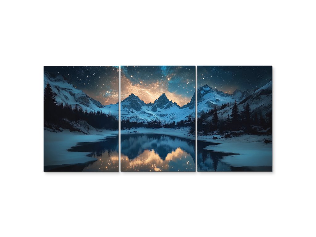 Majestátní zasněžené vrcholky hor pod zářivou noční oblohou plnou hvězd a barevného světla připomínajícího polární záři jsou vyobrazeny na trojdílném obraze. V popředí se rozprostírá klidné jezero, které zrcadlí krajinu a oblohu, přičemž jej lemují sněhem pokryté jehličnany.