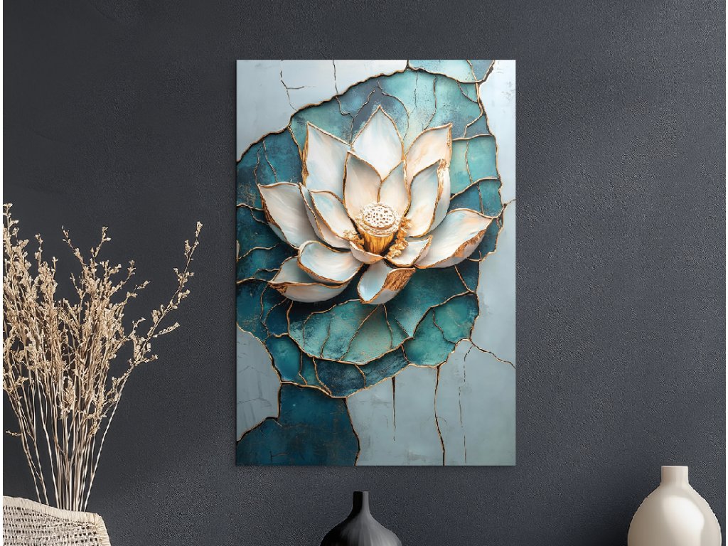 Mozaikové leknín je obraz s jemnou, ale výraznou atmosférou – bílé leknín se vyjímá na pozadí laděném do odstínů šedé, zelené a zlaté, které připomínají zlomkovou mozaiku nebo popraskaný povrch. Kontrast mezi čistotou květu a strukturovaným pozadím vytváří vyvážený vizuální dojem plný elegance a klidu. Ideální doplněk do moderního interiéru, kde vyniknou jeho tlumené tóny a harmonická kompozice.