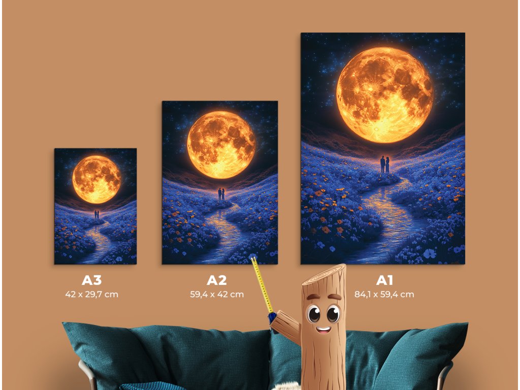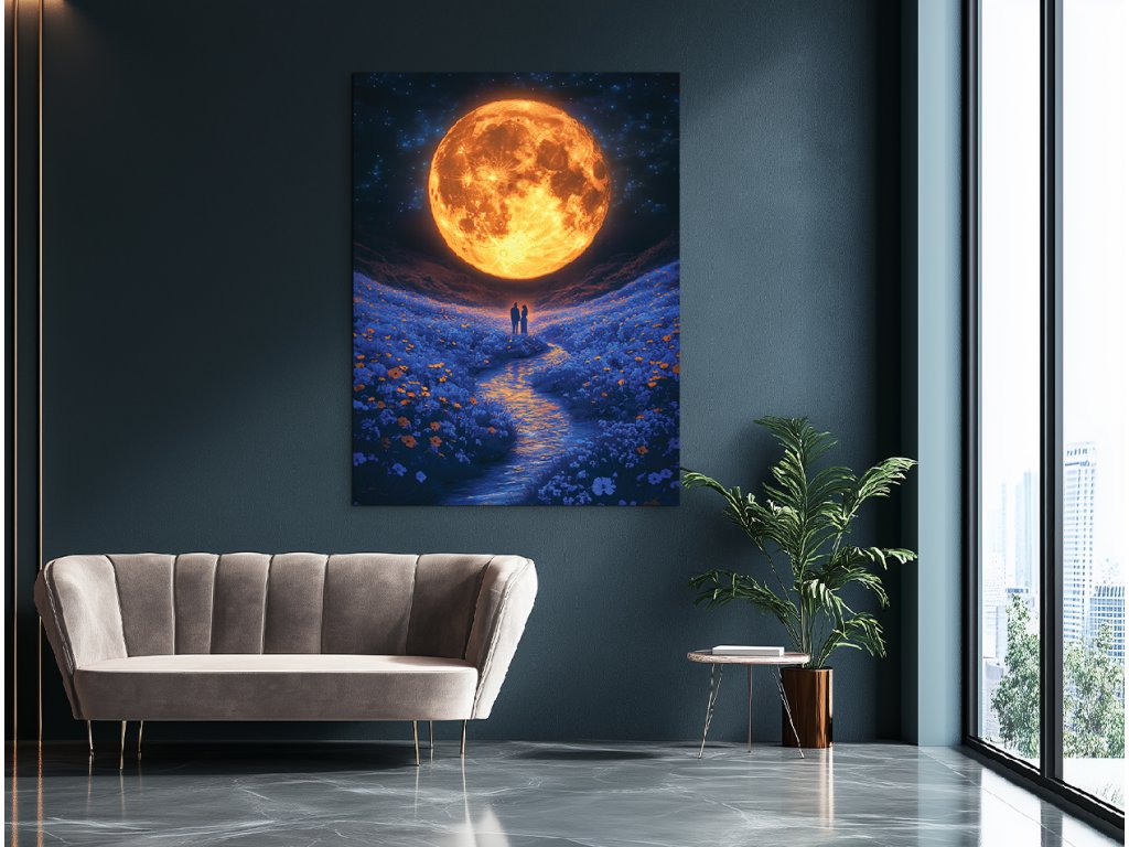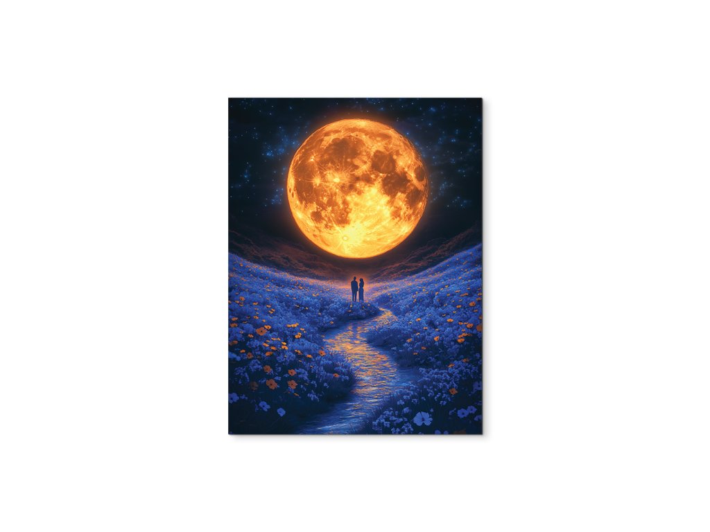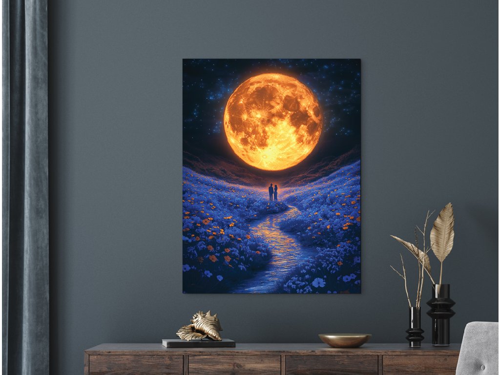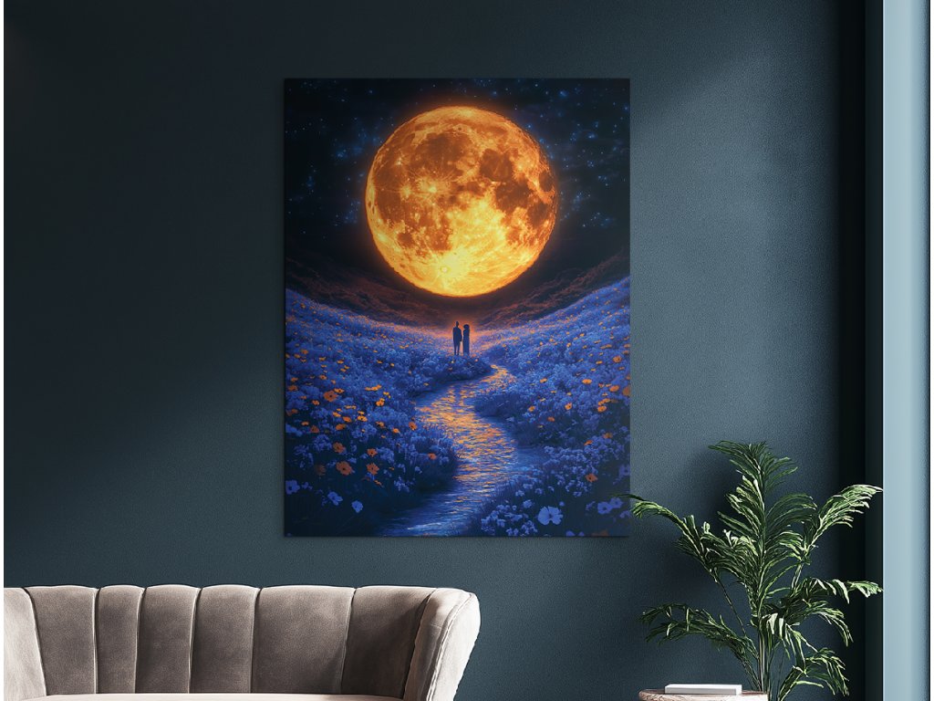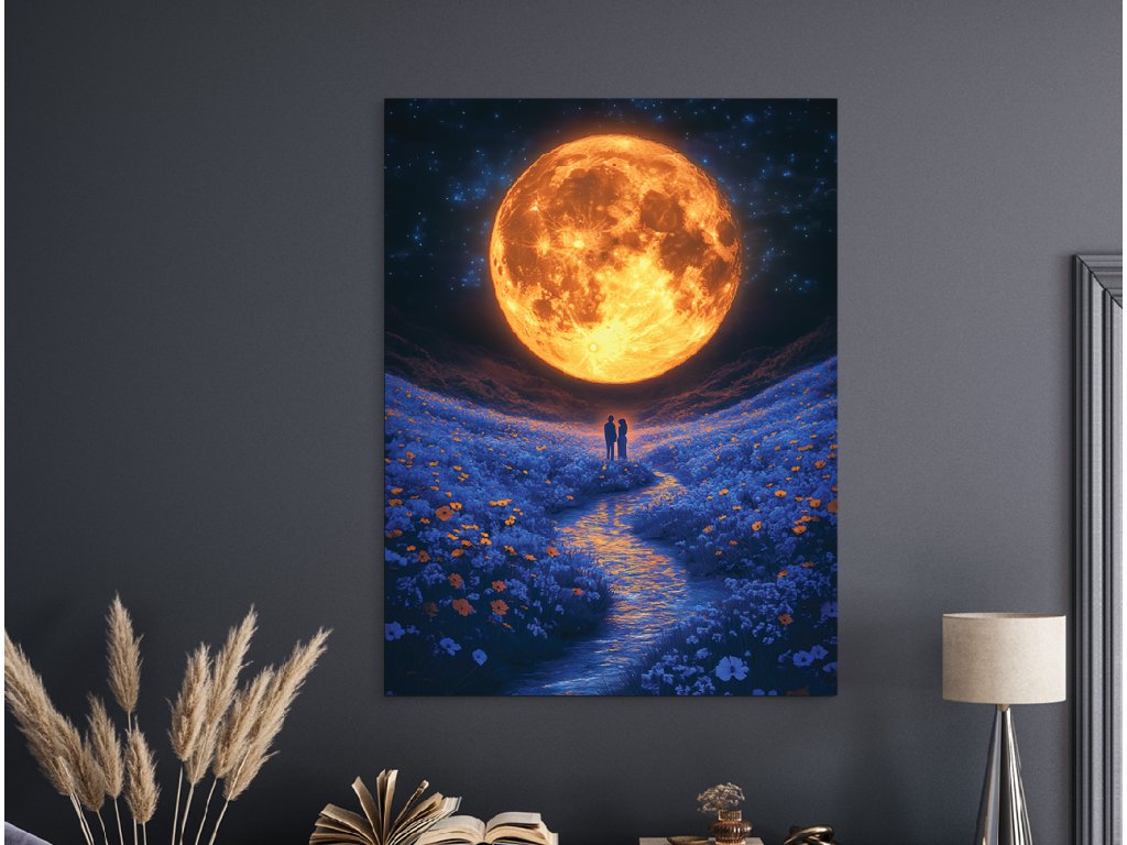 V objetí měsíce je moderní obraz s romantickým a snovým nábojem – obrovský, do oranžova zářící měsíc osvětluje květinovou louku, přes kterou tiše protéká potok. V centru kompozice stojí dvojice zamilovaných, ponořená do světla a klidu noci. Tento obraz vyzařuje teplo, něhu a intimitu – je ideální pro stěnu do ložnice nebo interiéru s jemným, romantickým duchem.