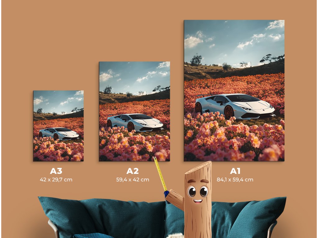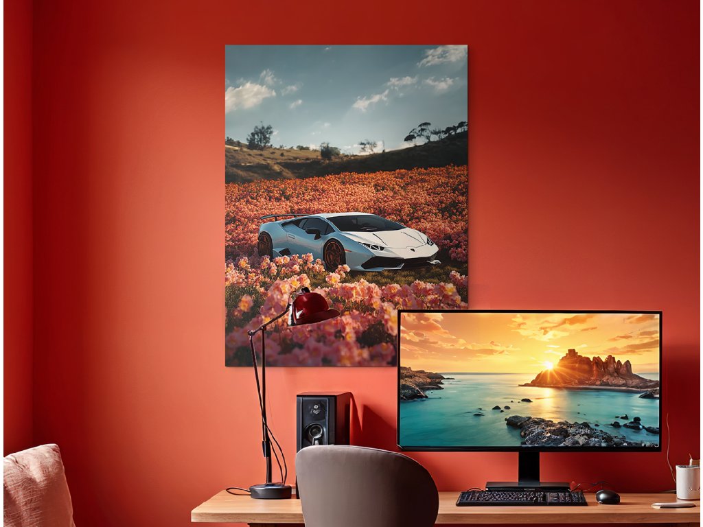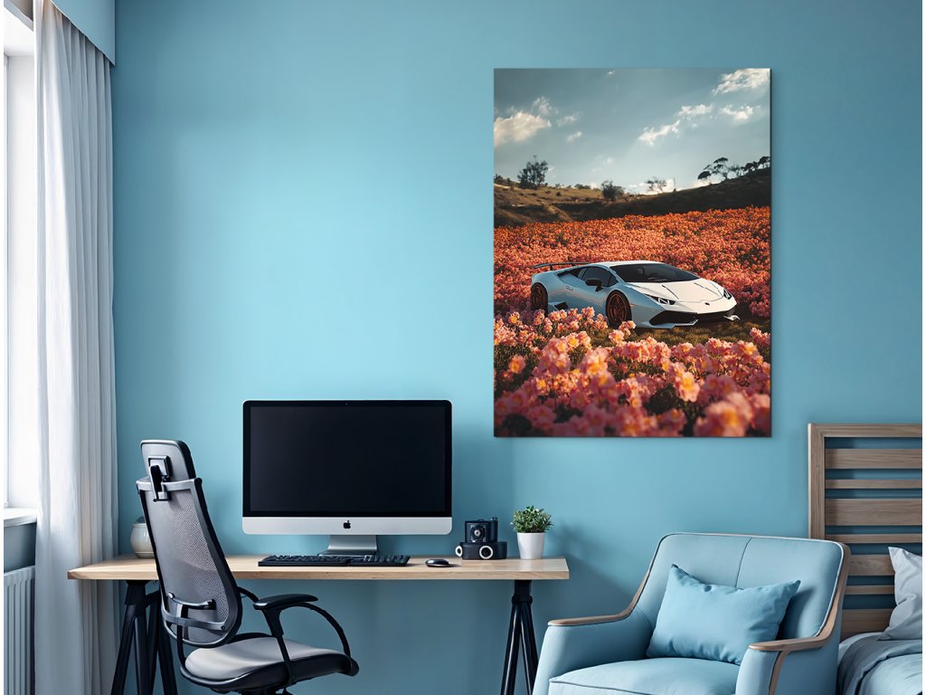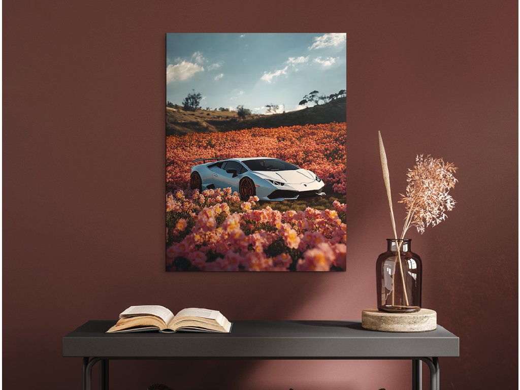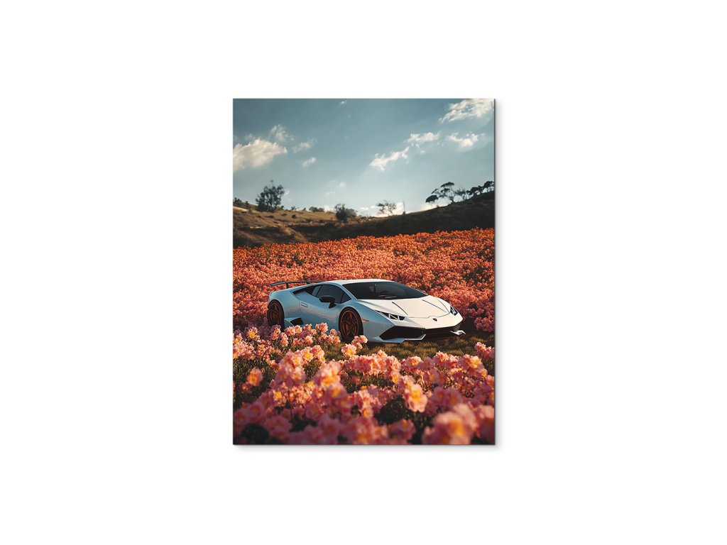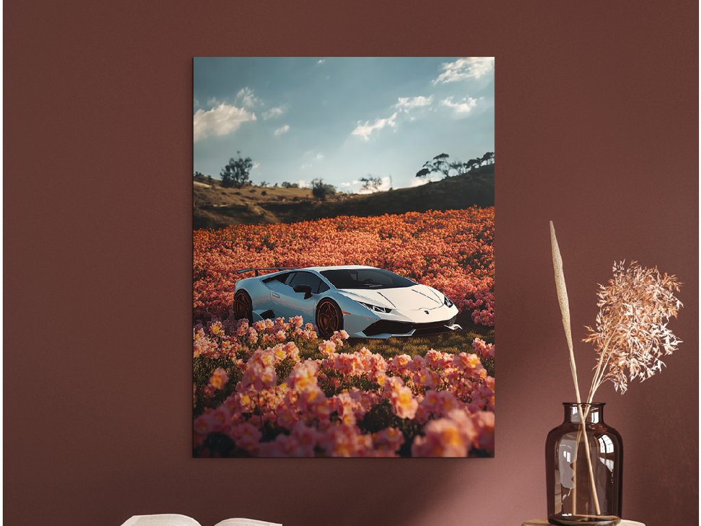 Divoká jemnost je obraz, který spojuje eleganci luxusního bílého Lamborghini Huracán s jemností rozkvetlého pole plného růžových květů. Tento nečekaný kontrast mezi technikou a přírodou je ještě umocněn malebnou kopcovitou krajinou v pozadí a klidnou oblohou s mraky. Obraz působí moderně, stylově a zároveň poeticky – ideální pro milovníky aut, designu i vizuální hry.