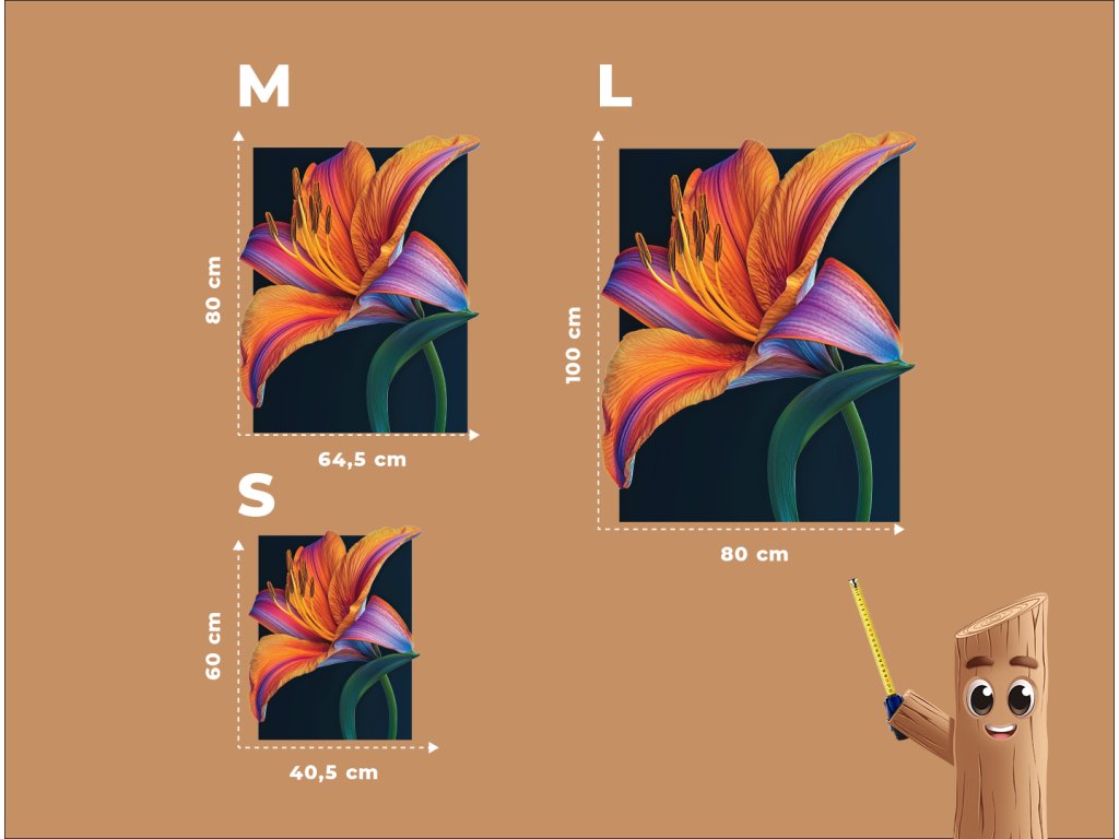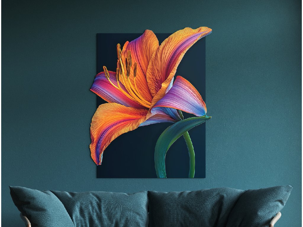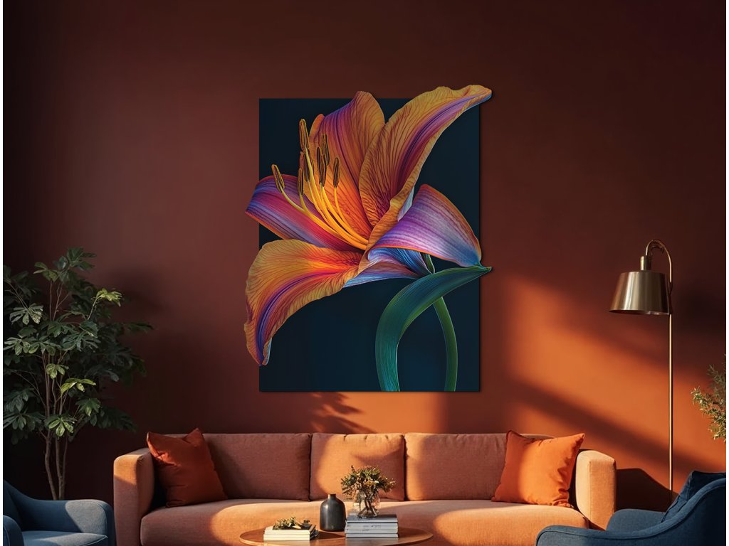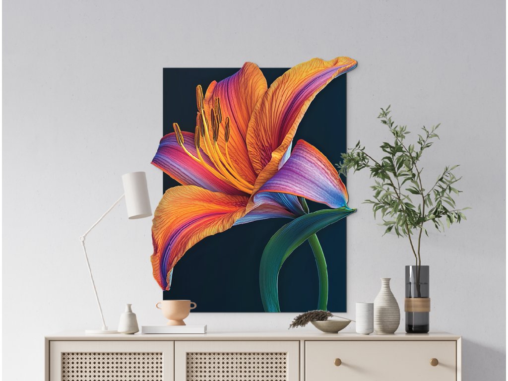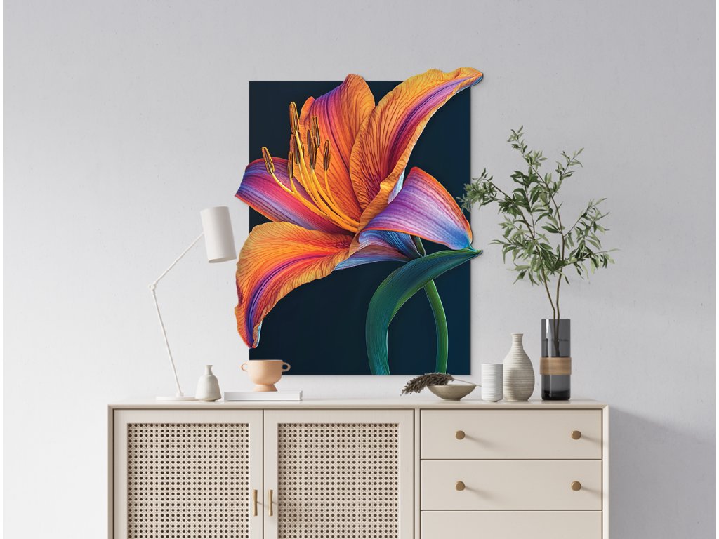 Umělecké zobrazení oranžové lilie na černém podkladu vytváří silný vizuální kontrast, který zvýrazňuje krásu a energii květu. Jasné okvětní lístky působí jako plameny rozzářené ve tmě, symbolizující vášeň, sílu a životní jiskru. Tento dramatický motiv je výrazným dekorativním prvkem s moderním nádechem.