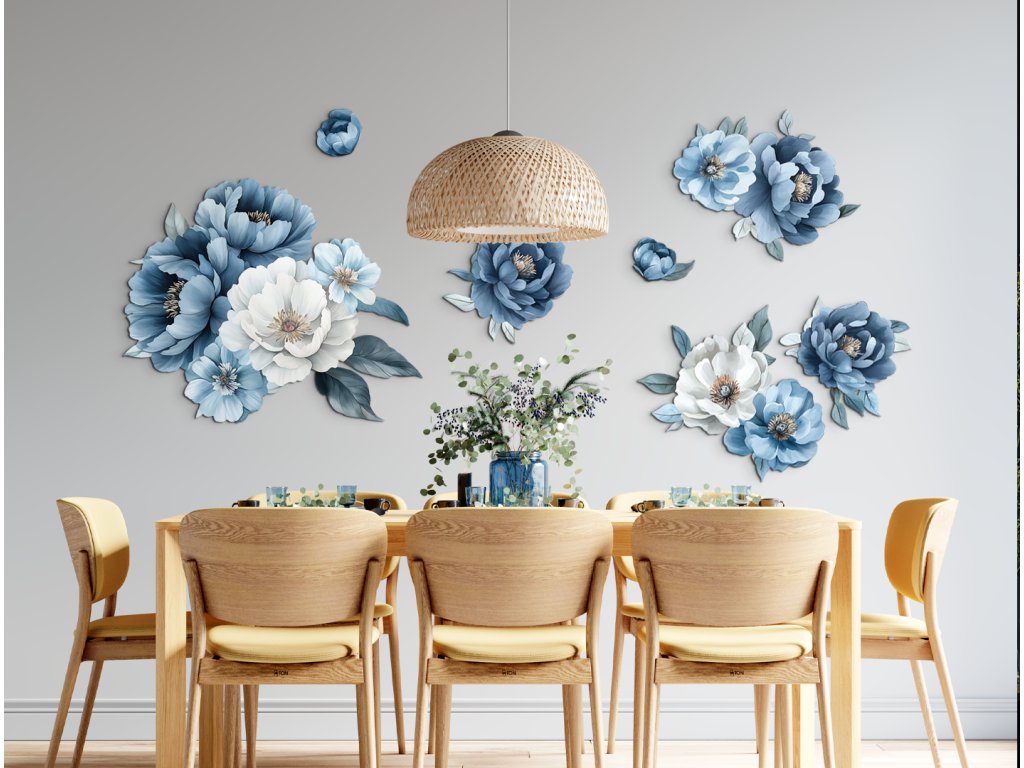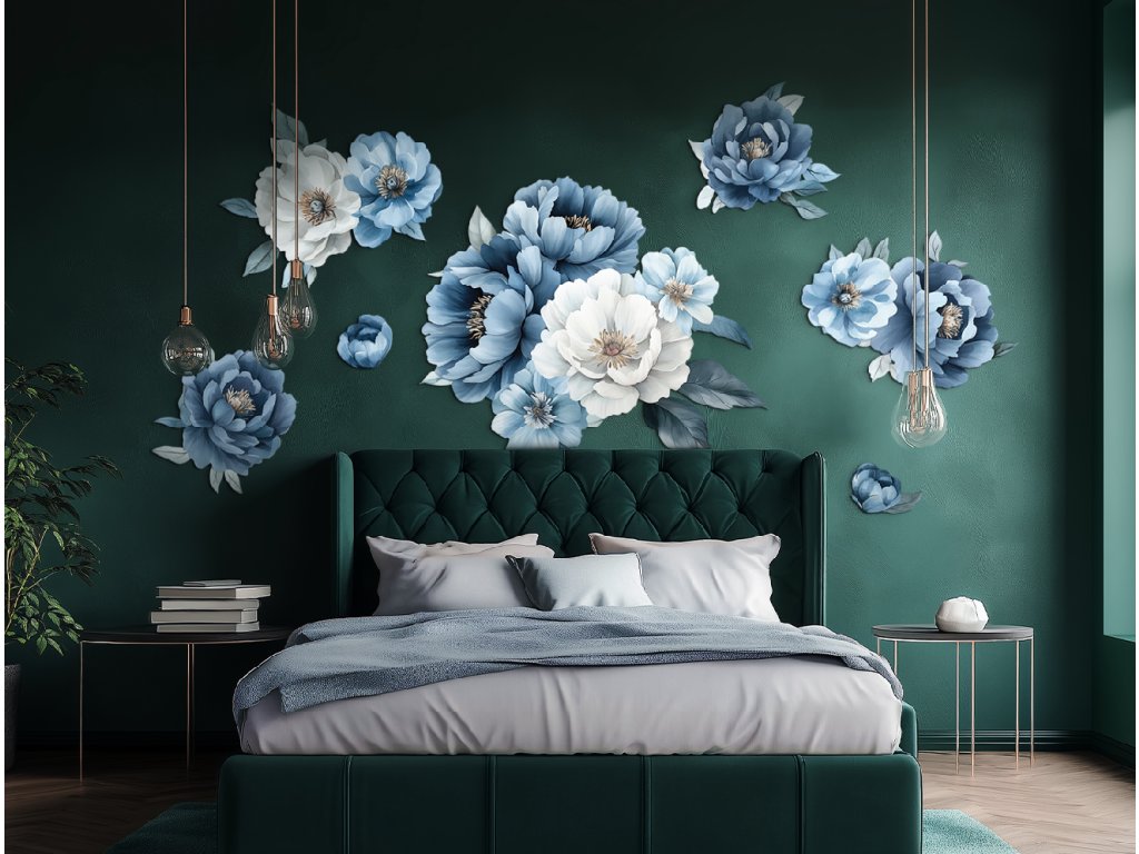 Volně malované květiny v odstínech bílé a modré, připomínající pivoňky nebo růže, vytvářejí jemnou a vzdušnou kompozici plnou elegance. Expresivní styl s akvarelovými přechody zvýrazňuje tvary květů a listů bez zbytečných detailů, čímž dílo působí svěže a moderně.