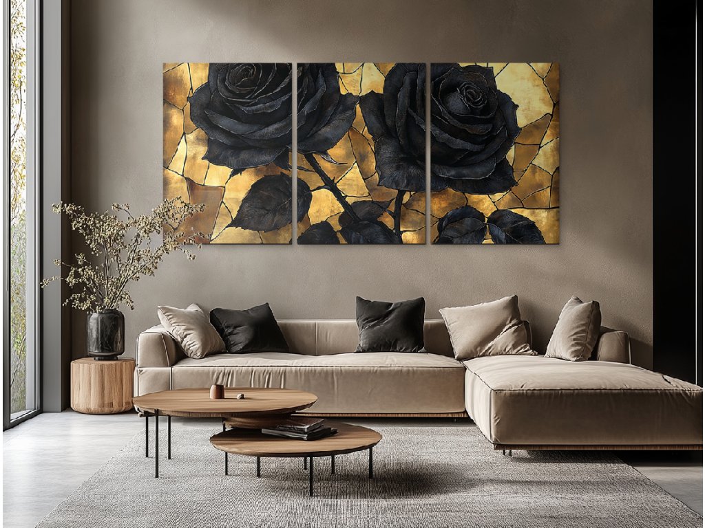 Mozaika černých růží je trojdílný obraz s originálním kontrastem – dvě černé růže umístěné na pozadí připomínajícím zlatou mozaiku nebo lesklé střepy rozbité vázy. Spojení tmavého květinového motivu s nepravidelným, zlatavým podkladem vytváří dojem luxusu, jemného dramatu a uměleckého detailu.