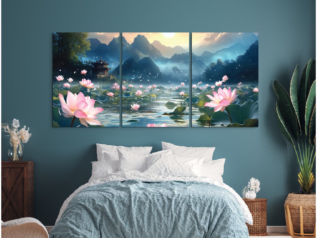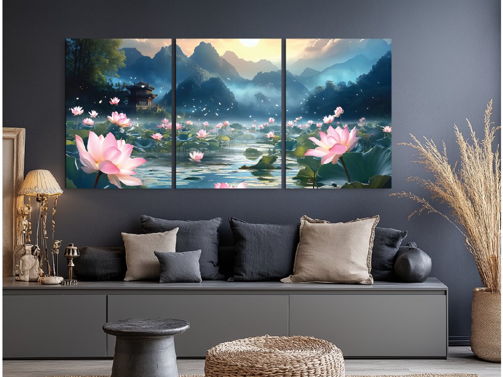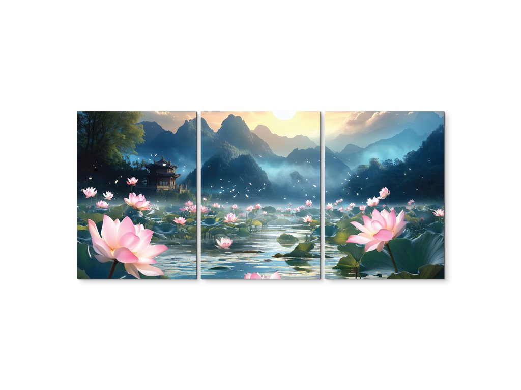 Ticho jezera je třídílný obraz zachycující klidný pohled na jezero plné leknínů pod siluetou hor, zalitý teplým večerním světlem zapadajícího slunce. Zlatavé odlesky na hladině a jemná barevná paleta vytvářejí uklidňující, romantickou atmosféru.
