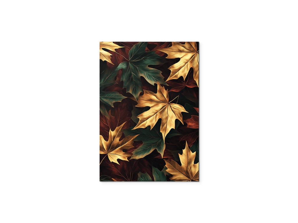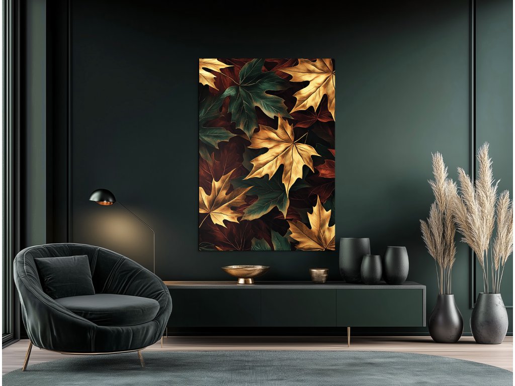 Javorový podzim je moderní obraz, který zachycuje krásu barevného podzimu přes javorové listy v odstínech žluté, zlaté, tmavě zelené, černé a oranžové. Tmavé pozadí umožňuje vyniknout bohaté paletě barev a vytváří hřejivou, ale zároveň elegantní atmosféru. Skvělý doplněk do obývacího pokoje, předsíně nebo interiéru s přírodními prvky.
