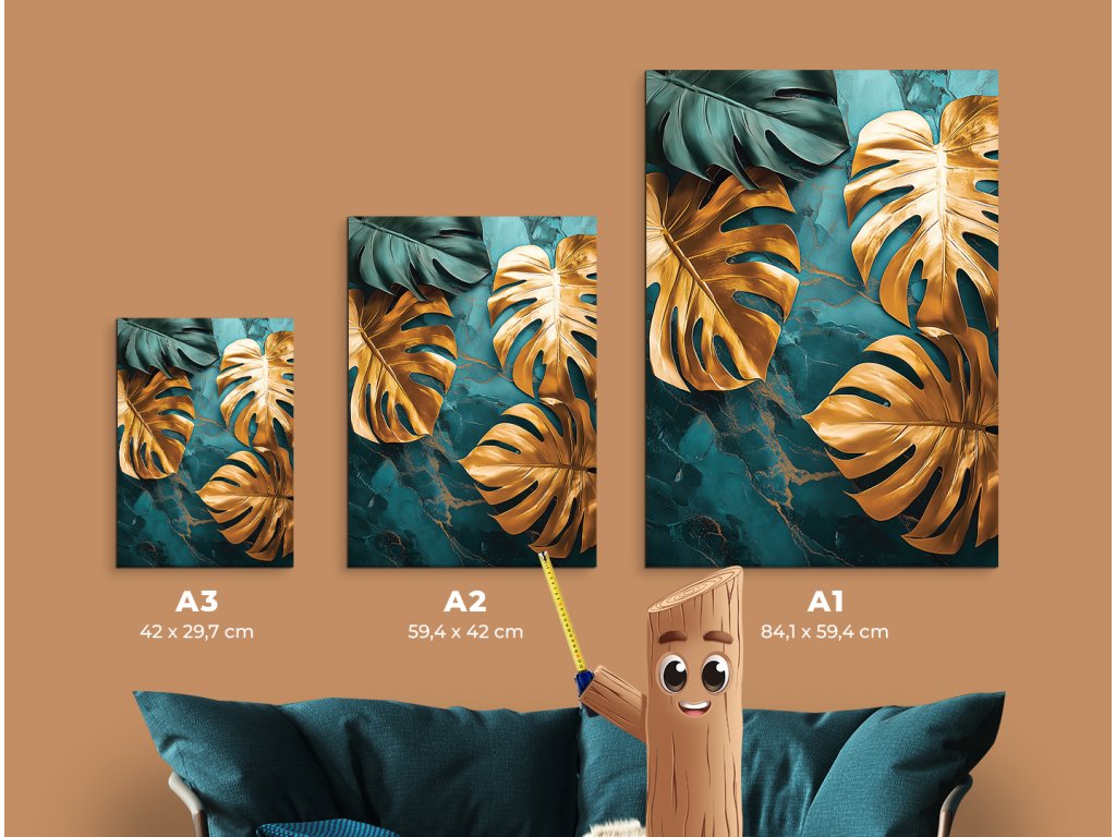 Zlatá monstera upoutá pohled lesklými listy ve zlatém provedení, které kontrastují se smaragdově-mramorovým pozadím. Spojení luxusu a přírody působí exkluzivně a zároveň harmonicky.