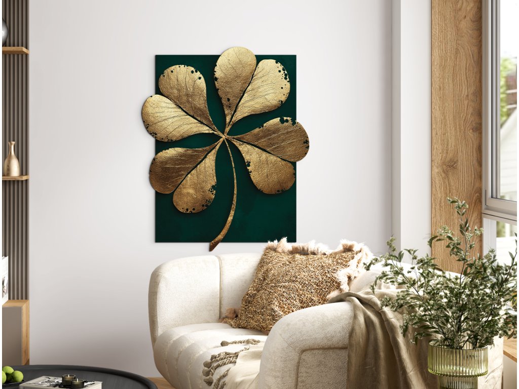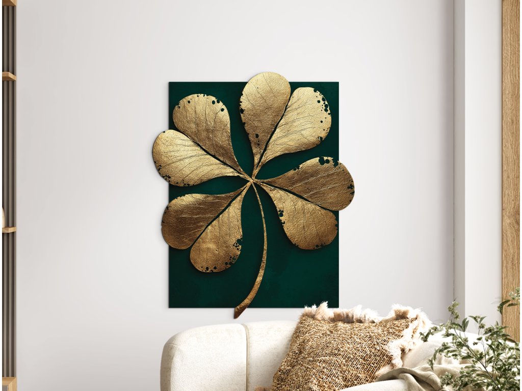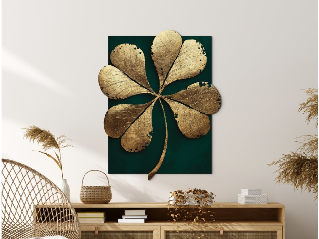 Obraz Čtyřlístek zachycuje symbol štěstí ve zlatém odstínu na smaragdově zeleném pozadí, které zvýrazňuje jeho jedinečný, nepravidelný tvar. Elegantní kombinace kontrastu a asymetrie působí moderně, ale zároveň ukrývá jemný nádech mystiky. Syté tóny UV barev ručí za to, že potisk čtyřlístku na materiálu opticky působí plně a hluboko.