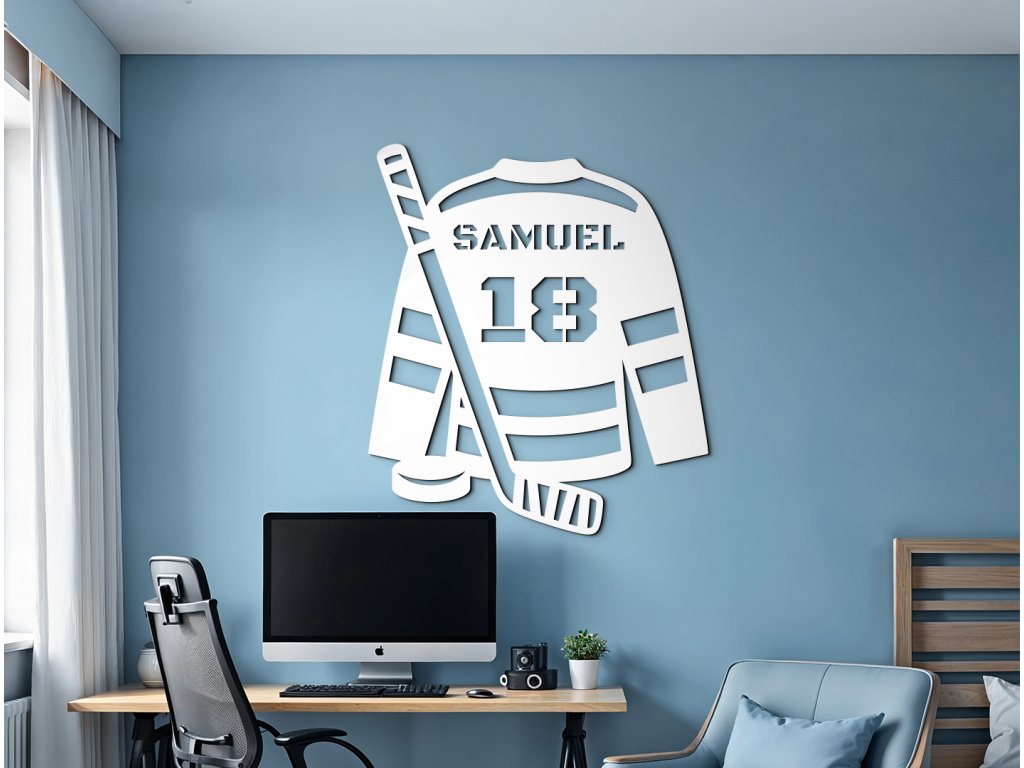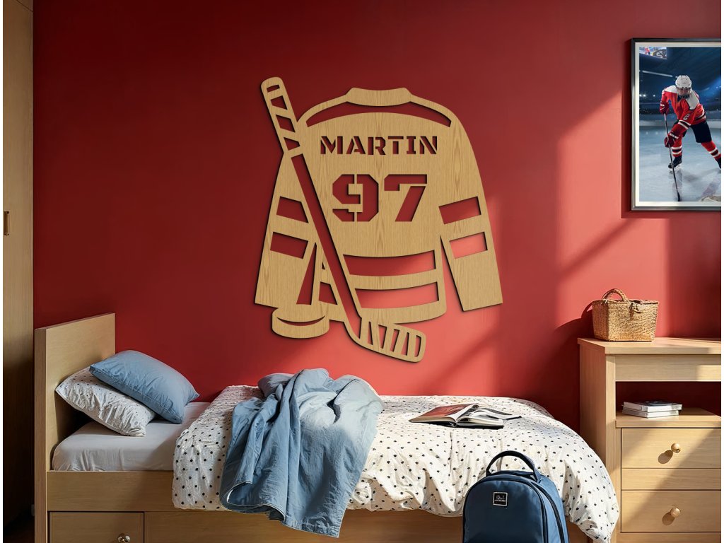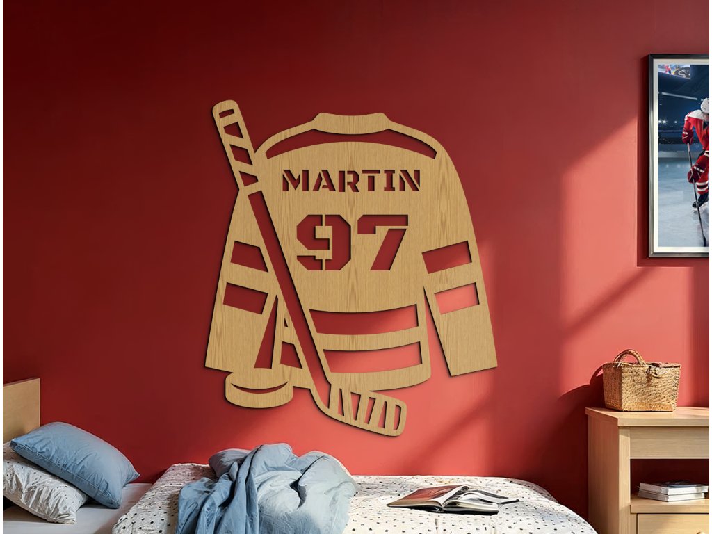Dřevěný obraz Hokejový dres na míru je jedinečná nástěnná dekorace pro všechny hokejisty a fanoušky ledu. Díky možnosti vlastního jména a čísla si můžete vytvořit svůj osobní dres – přesně podle sebe nebo jako originální dárek. Precizní vyřezávání zvýrazňuje každý detail, takže dekorace působí realisticky a moderně. Vyberte si barevnou variantu, přidejte své jméno a číslo – a získejte dřevěný dres s duší hráče.