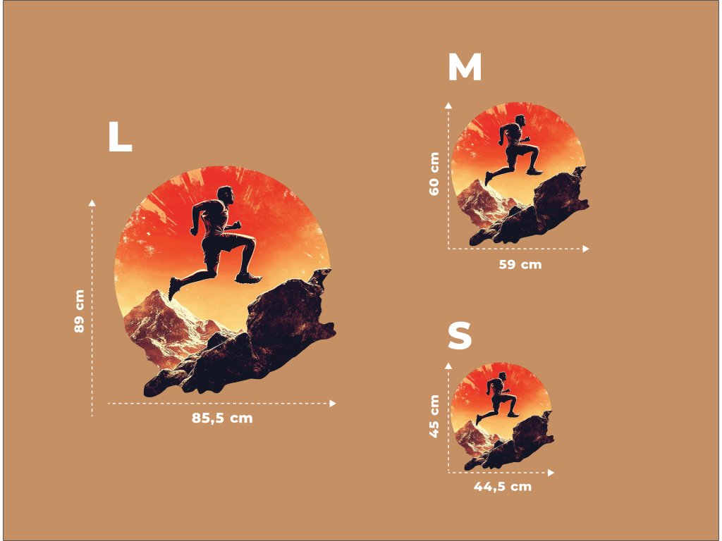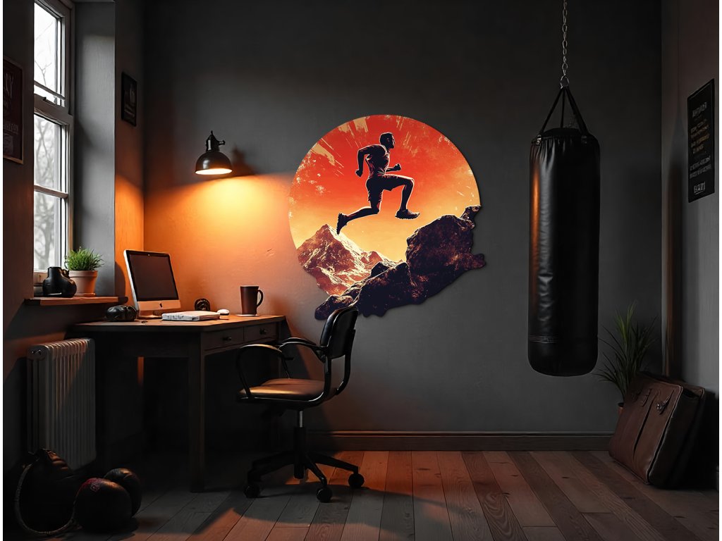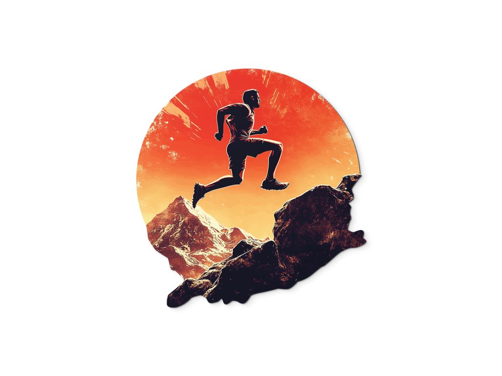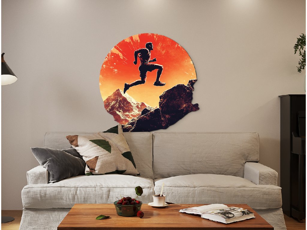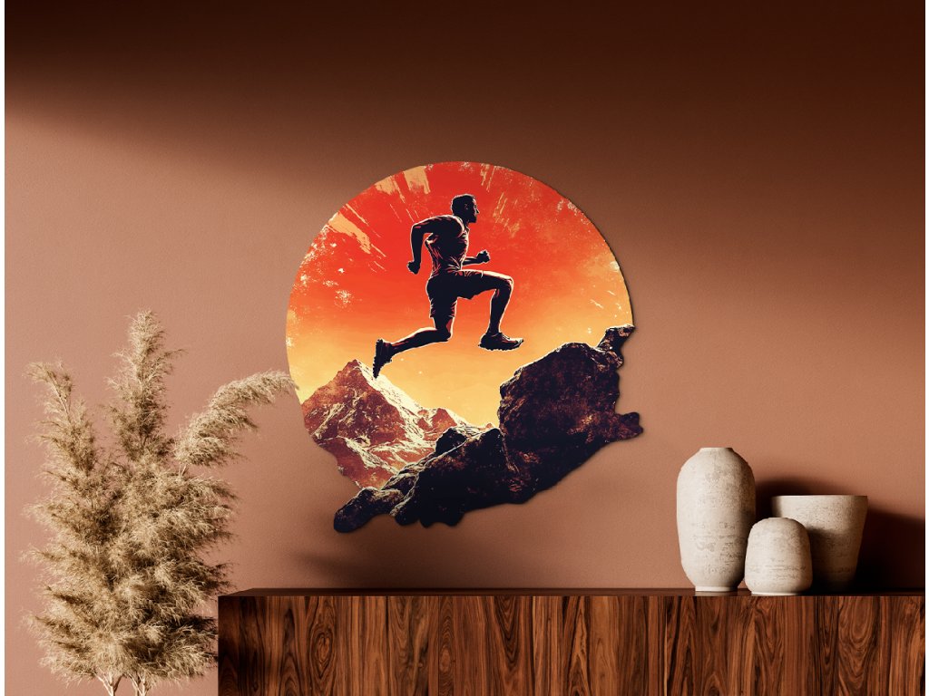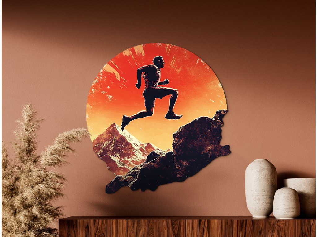 Obraz zobrazuje siluetu běžce ve skoku nad skalnatou krajinou, zasazenou do výrazného oranžového pozadí připomínajícího západ slunce nebo výbuch energie. Kontrast mezi tmavou siluetou a zářivým pozadím vytváří dramatickou kompozici, která ztělesňuje pohyb, svobodu a překonávání překážek.