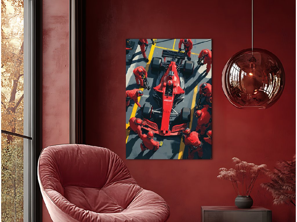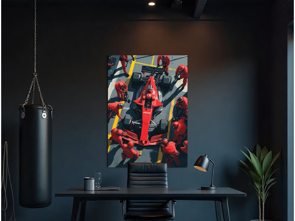 Fascinující obraz zachycuje dramatický moment výměny pneumatik během zastávky v boxech Formule 1. Dynamická kompozice vyjadřuje rychlost, přesnost a týmovou spolupráci, které definují svět F1.