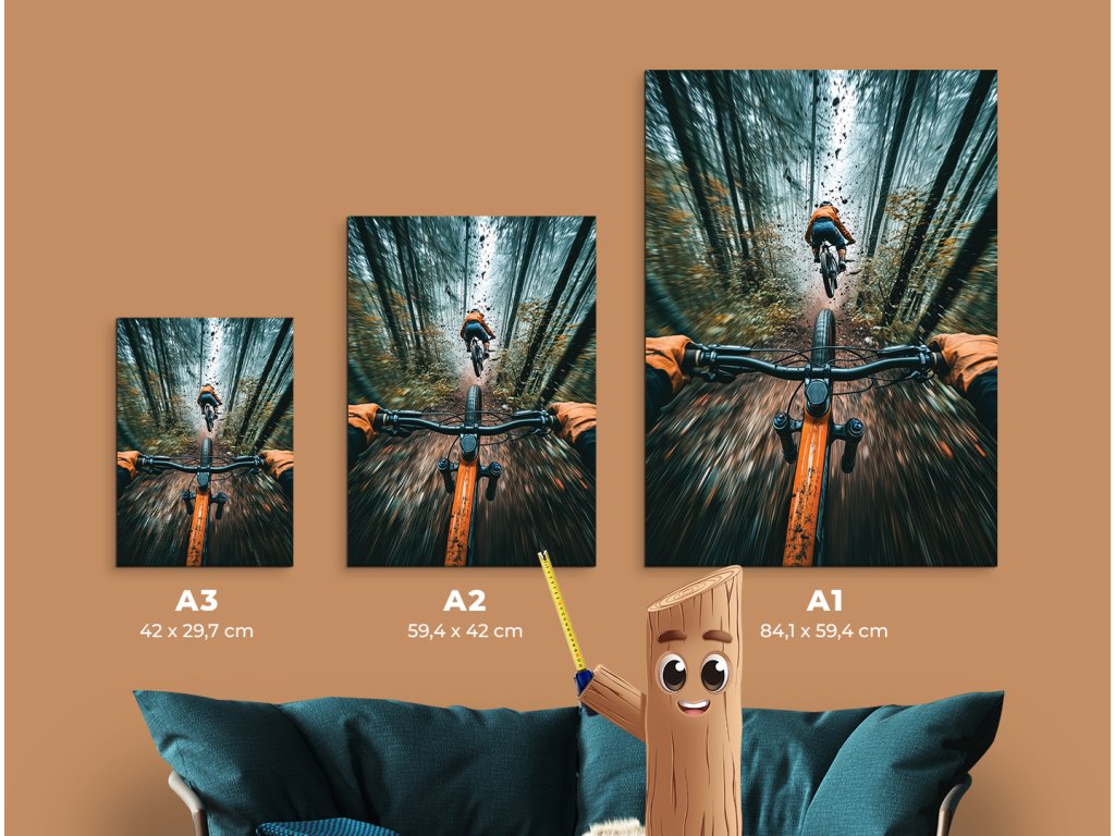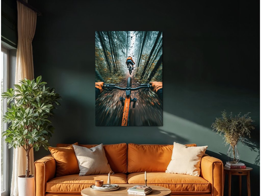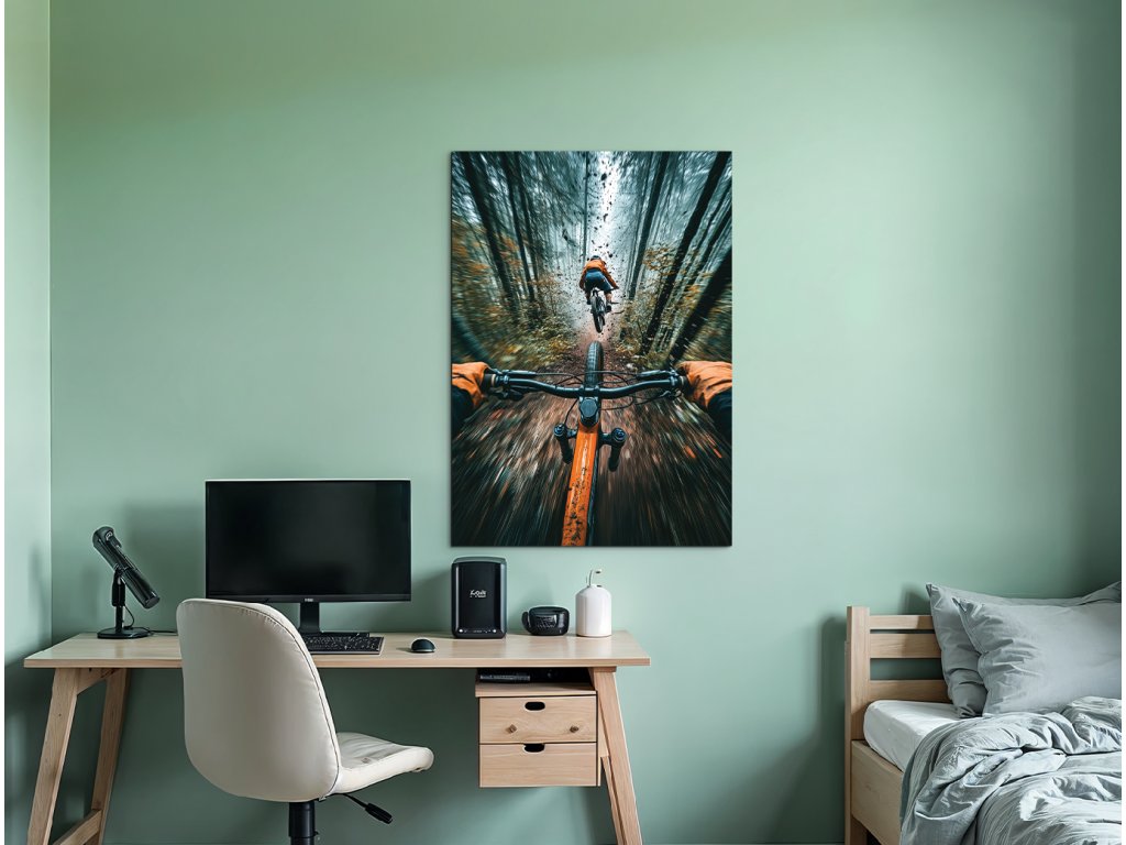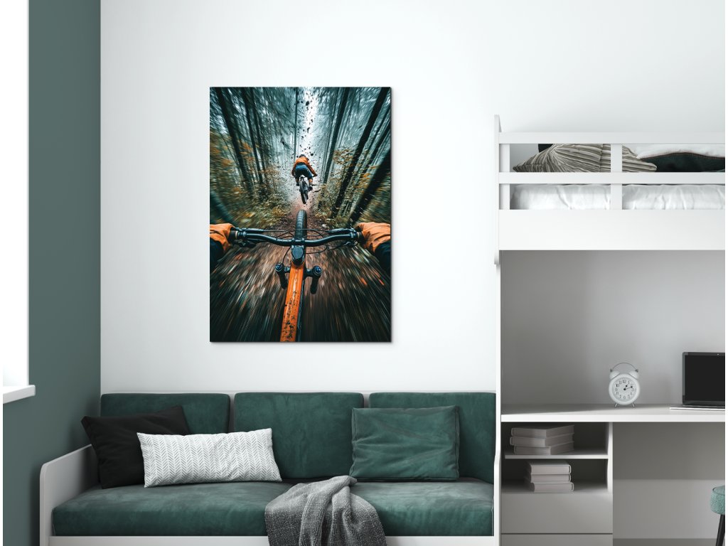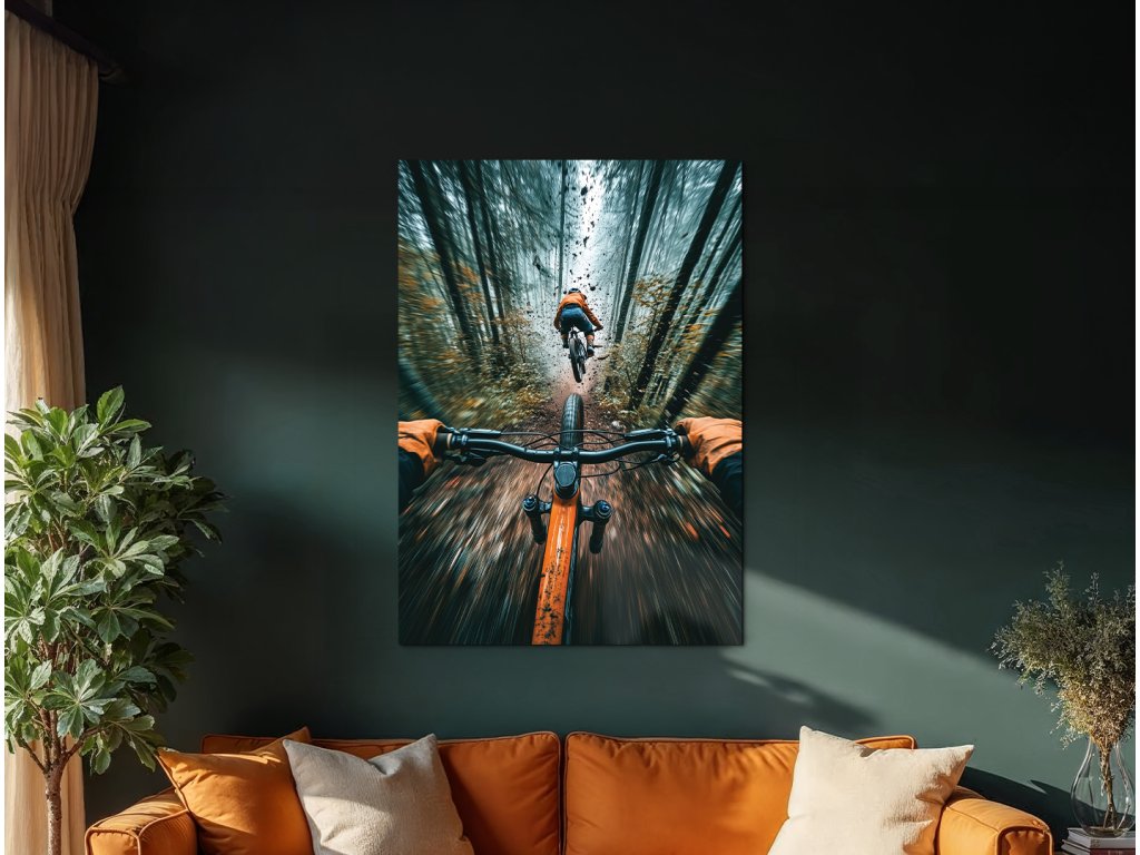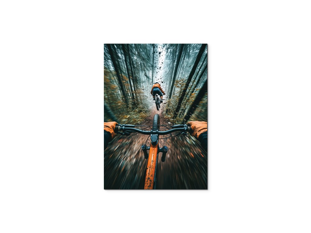 Moderní obraz, který zobrazuje pohled jezdce na horském kole, který jezdí lesním chodníkem. Před ním jede další cyklista, což vytváří dojem pohybu a dobrodružství.