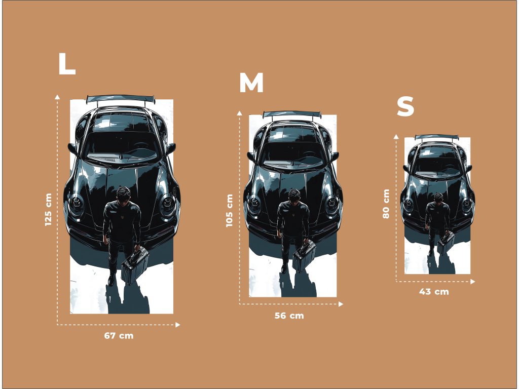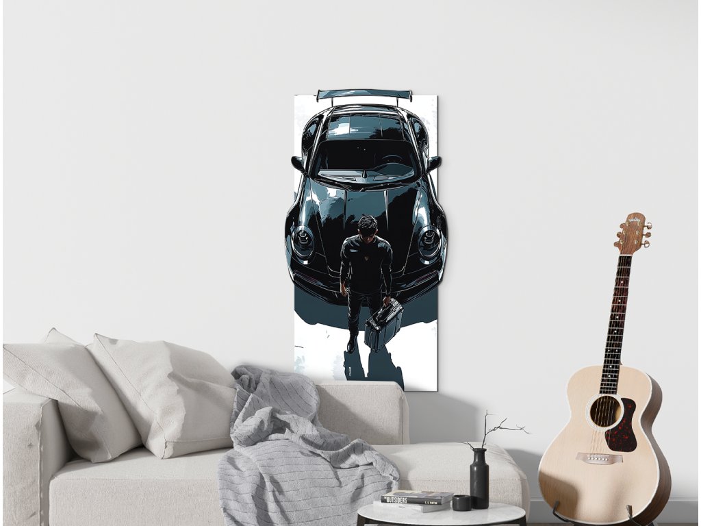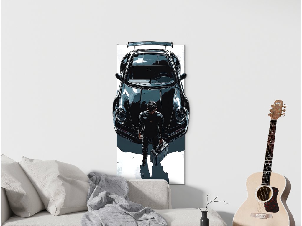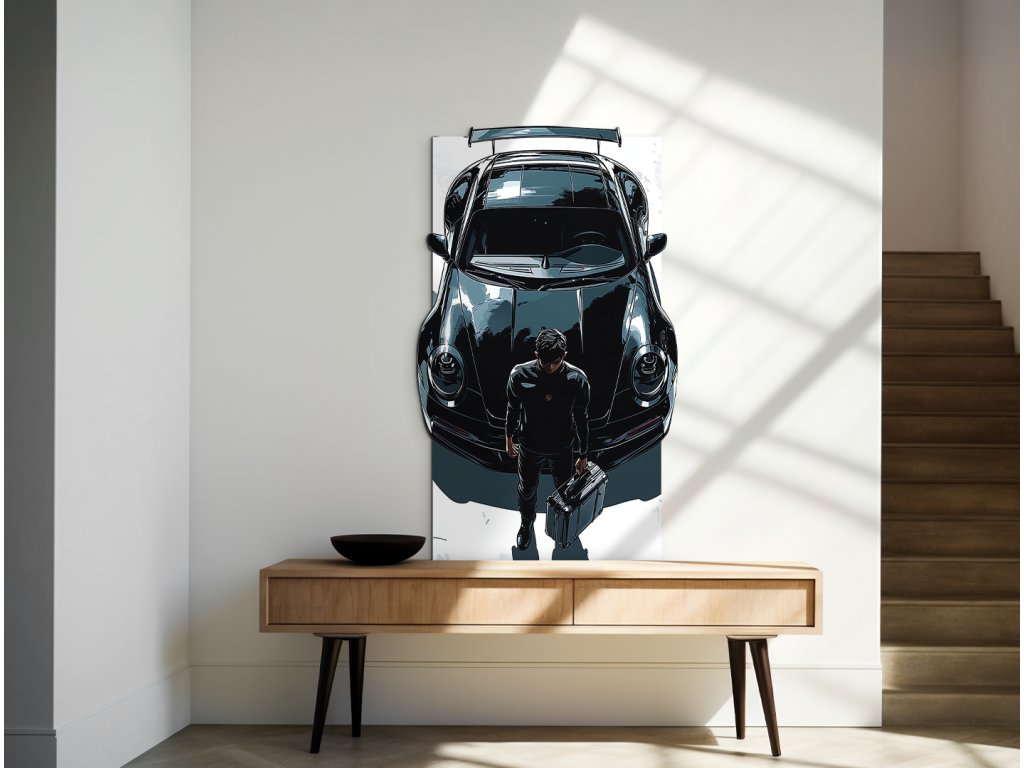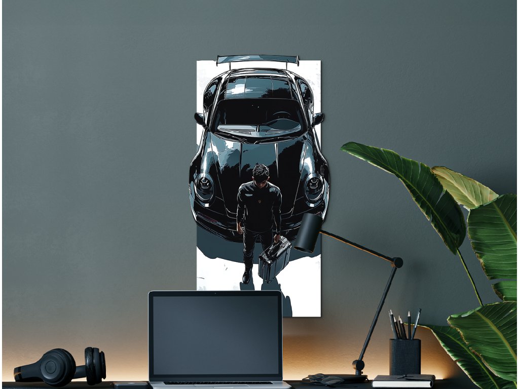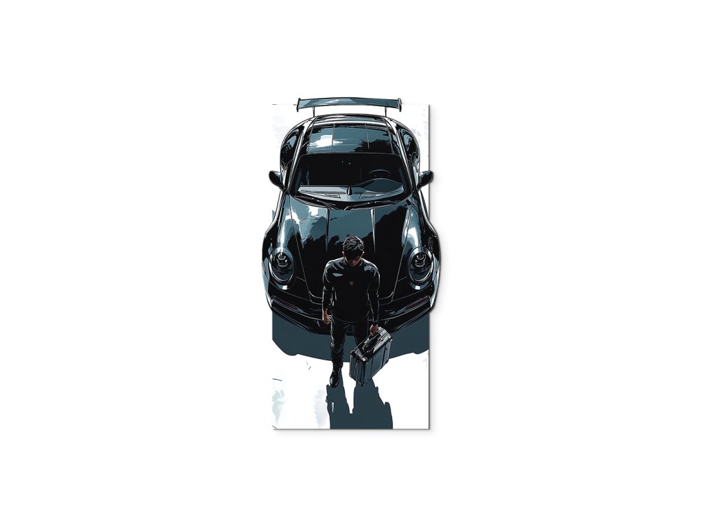 Obraz zobrazuje pohled shora na elegantní tmavé sportovní auto, pravděpodobně typu Porsche, s výrazným zadním křídlem, které zdůrazňuje jeho dynamický charakter. Před vozem stojí osamocená postava člověka s kufrem, čelem obrácená k autu. Celá kompozice působí promyšleně, evokuje téma odchodu, dobrodružství nebo životního rozhodnutí.