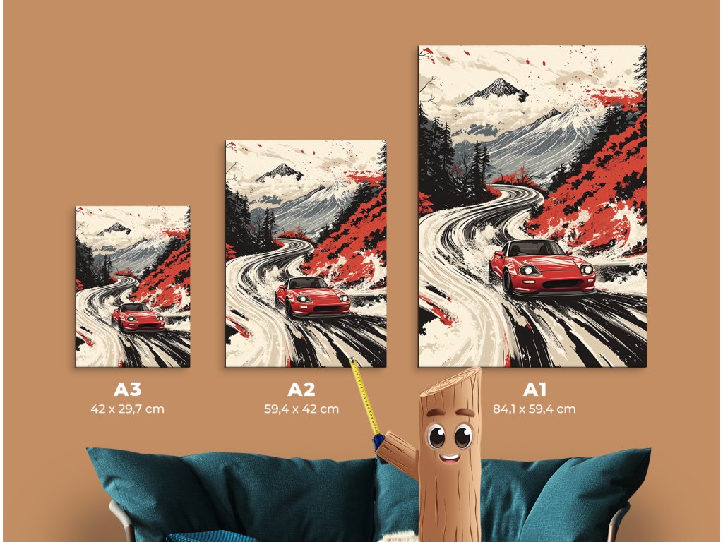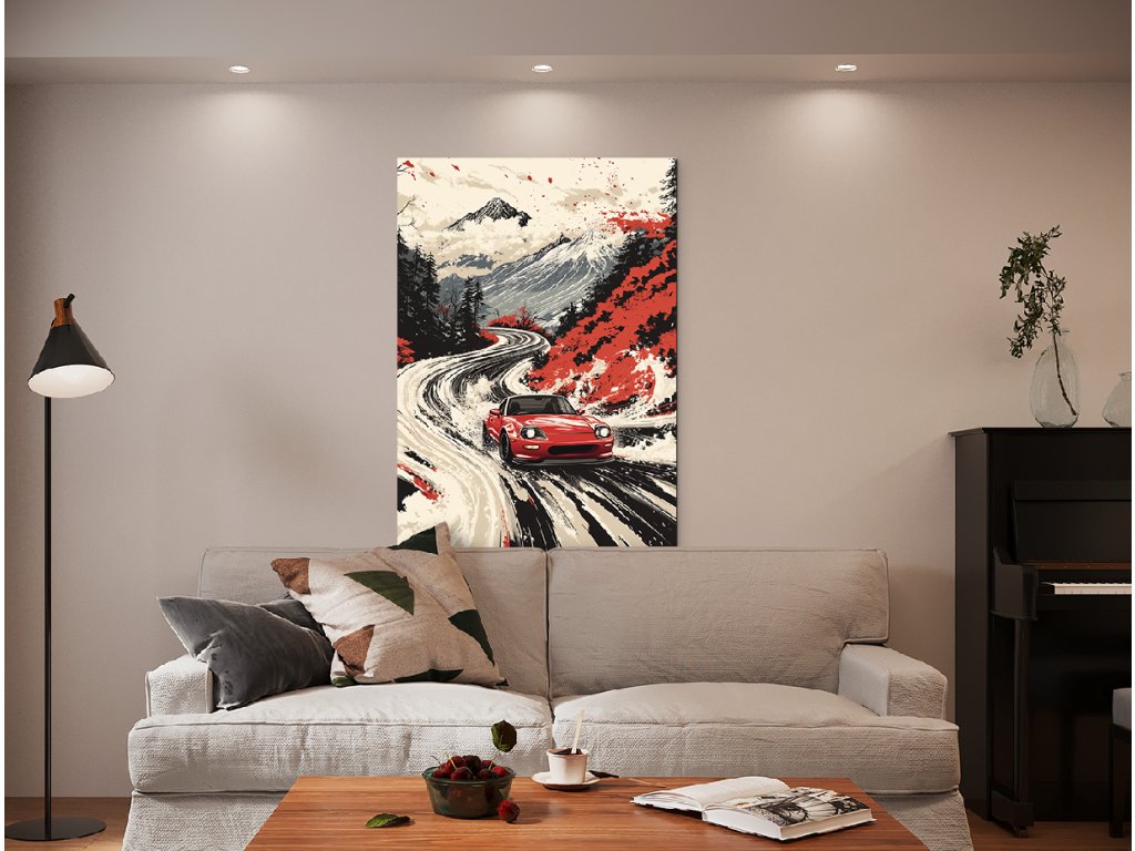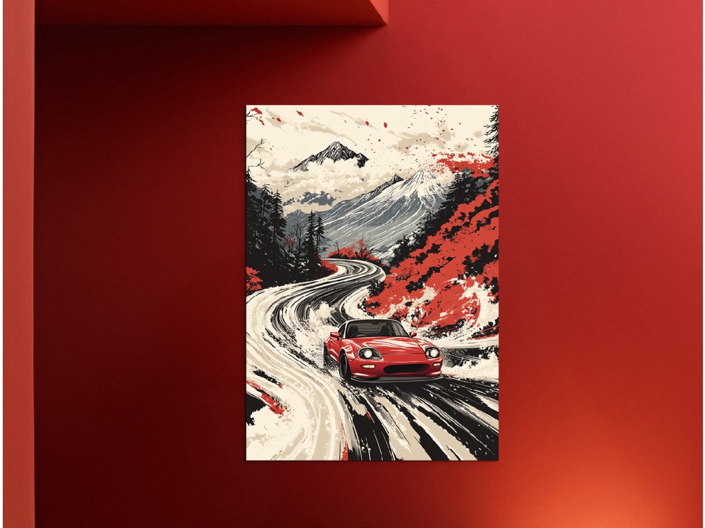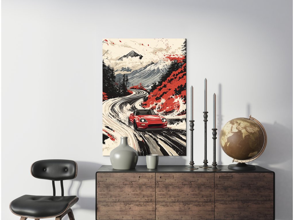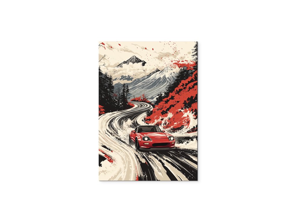 Obraz zachycuje červený sportovní vůz jezdící po klikaté horské silnici. Scéna je ztvárněna v japonském uměleckém stylu, který spojuje tradiční prvky krajiny s moderním designem vozu, čímž vytváří dynamickou a vizuálně působivou kompozici.