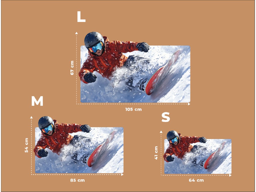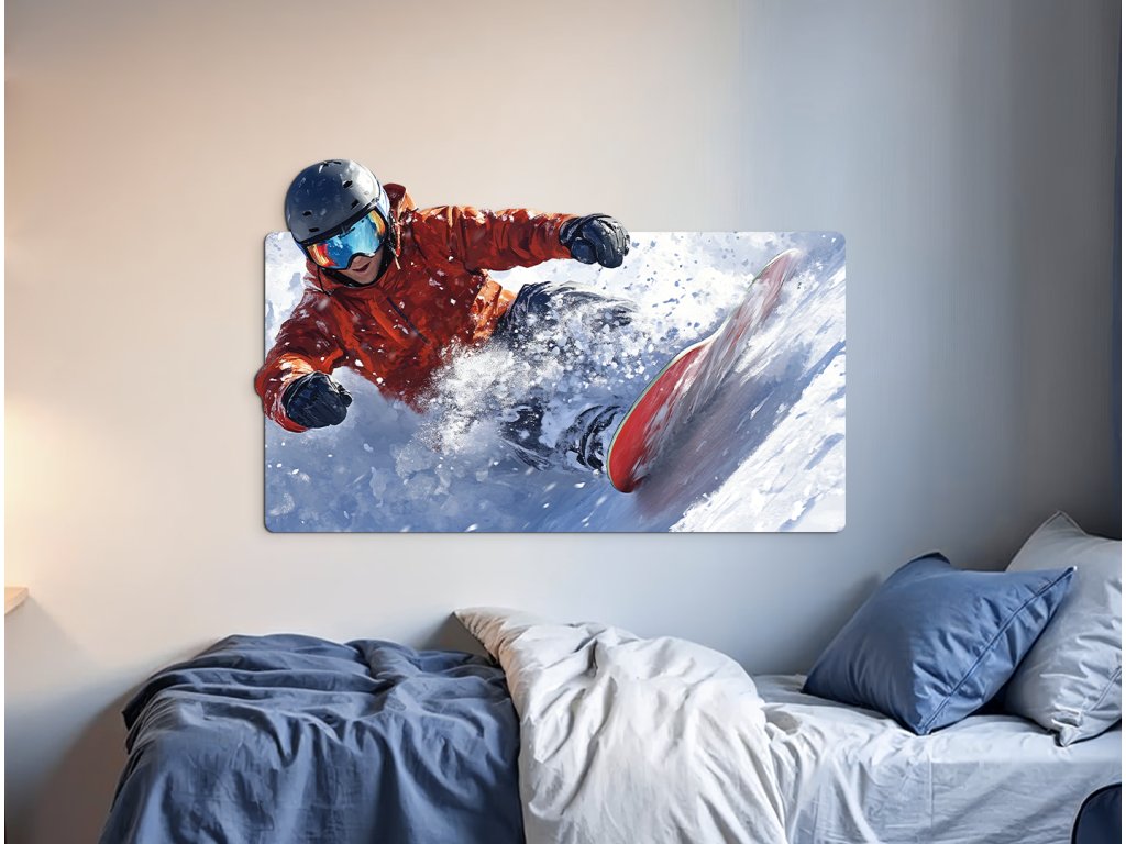 Obrázek zachycuje snowboardistu v dynamické póze během skoku nebo jízdy, obklopeného prachovým sněhem. Bílý zasněžený terén a pohybová stopa vytvářejí dojem rychlosti, svobody a energie.