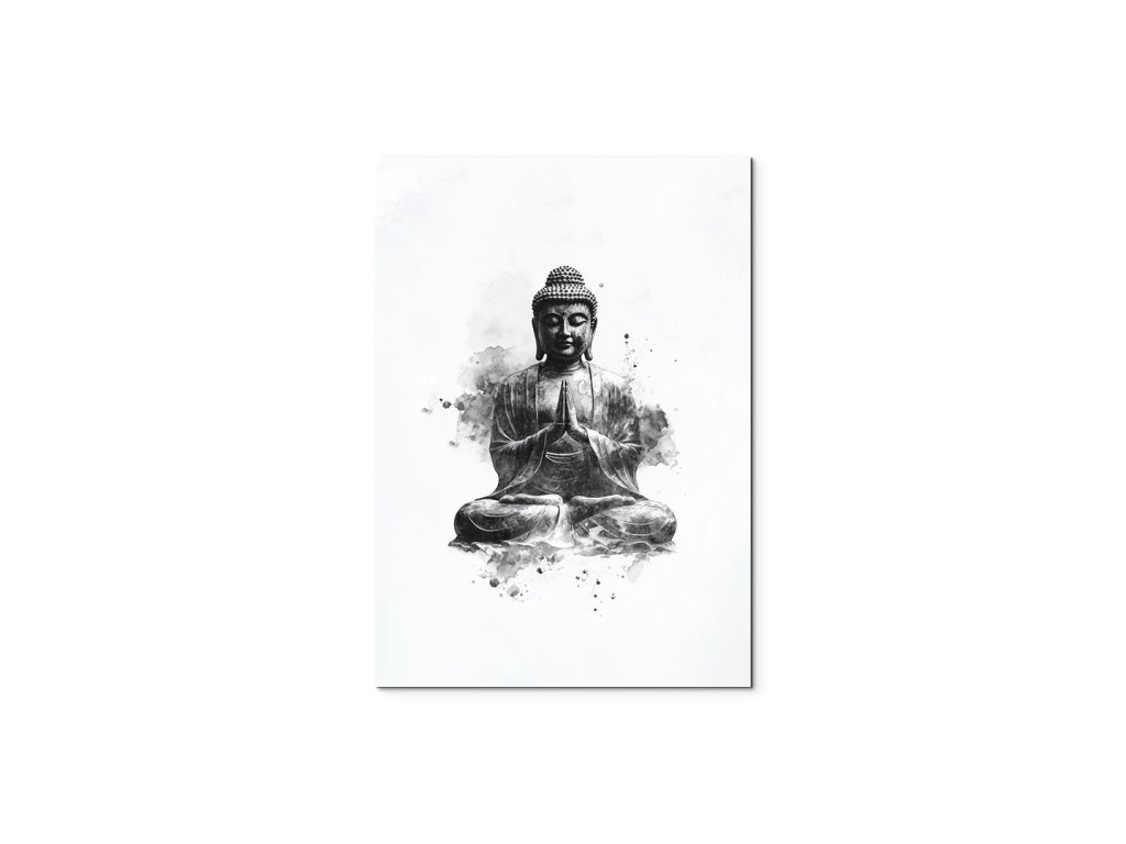 Minimalistický obraz zobrazuje nakreslenou sochu Buddhy na bílém pozadí. Socha symbolizuje klid, duchovní probuzení a učení buddhismu, připomínajíc cestu k vnitřnímu míru a osvícení.