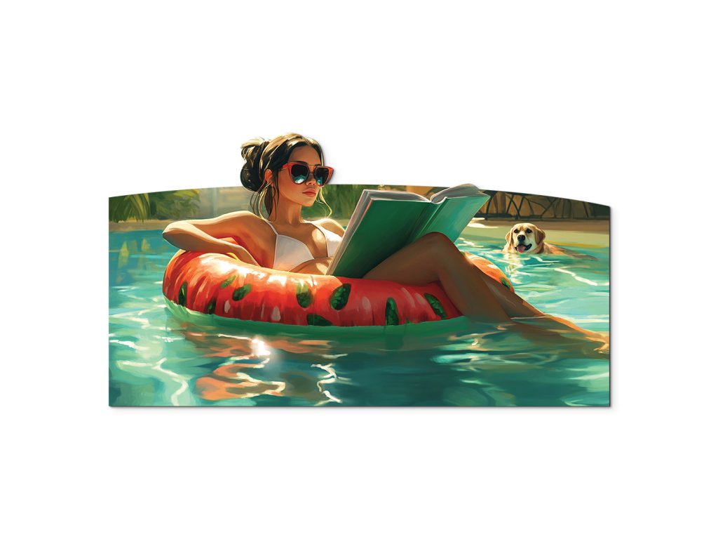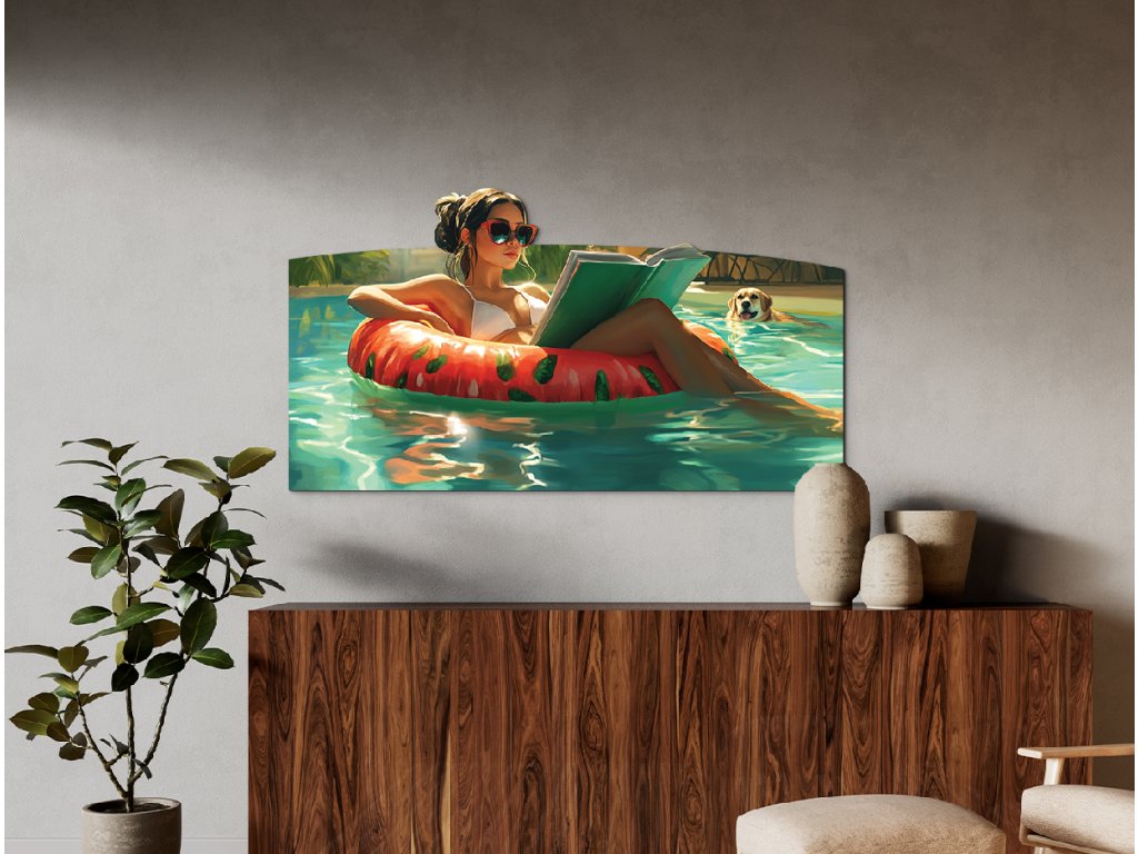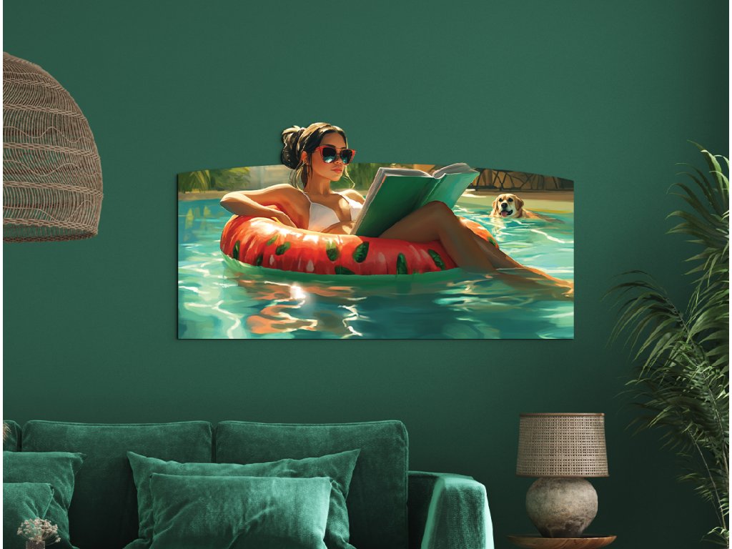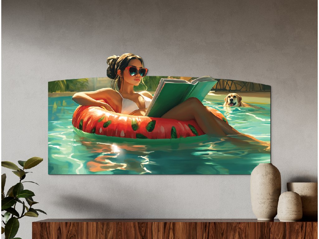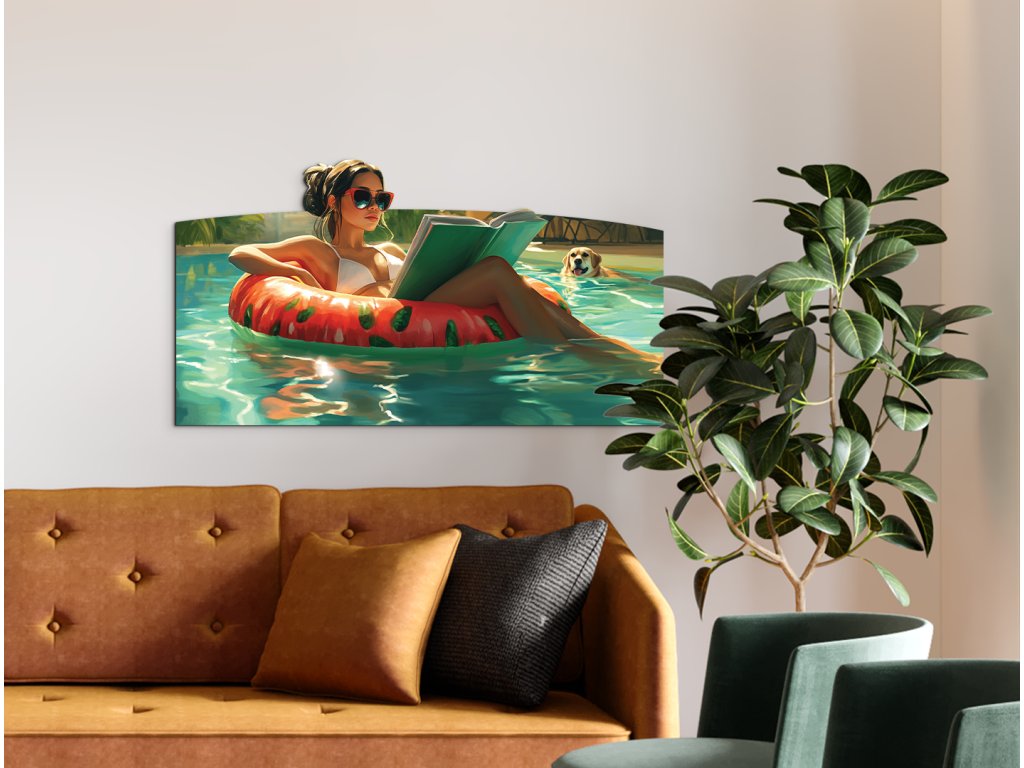 Obraz zachycuje klidnou letní scénu – žena na červeném nafukovacím kruhu ve tvaru melounu si čte knihu, zatímco v bazénu plave pes. Atmosféra je uvolněná, plná slunečního tepla a odpočinku u vody.