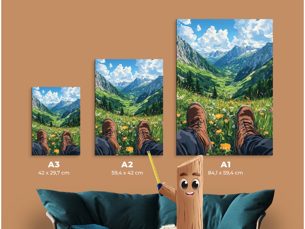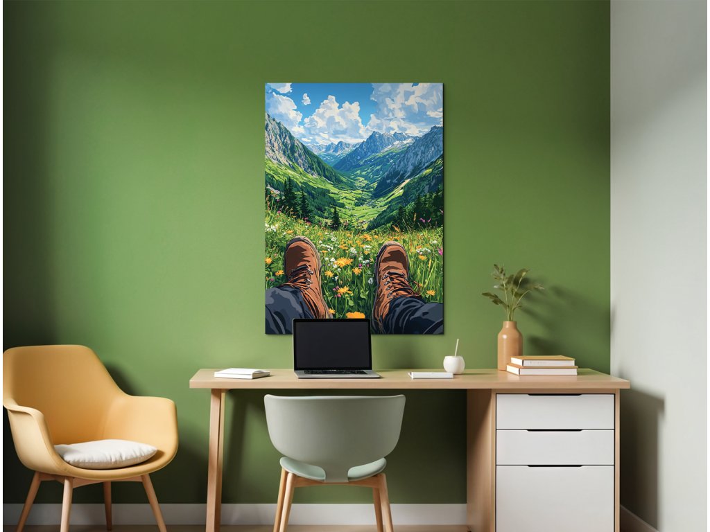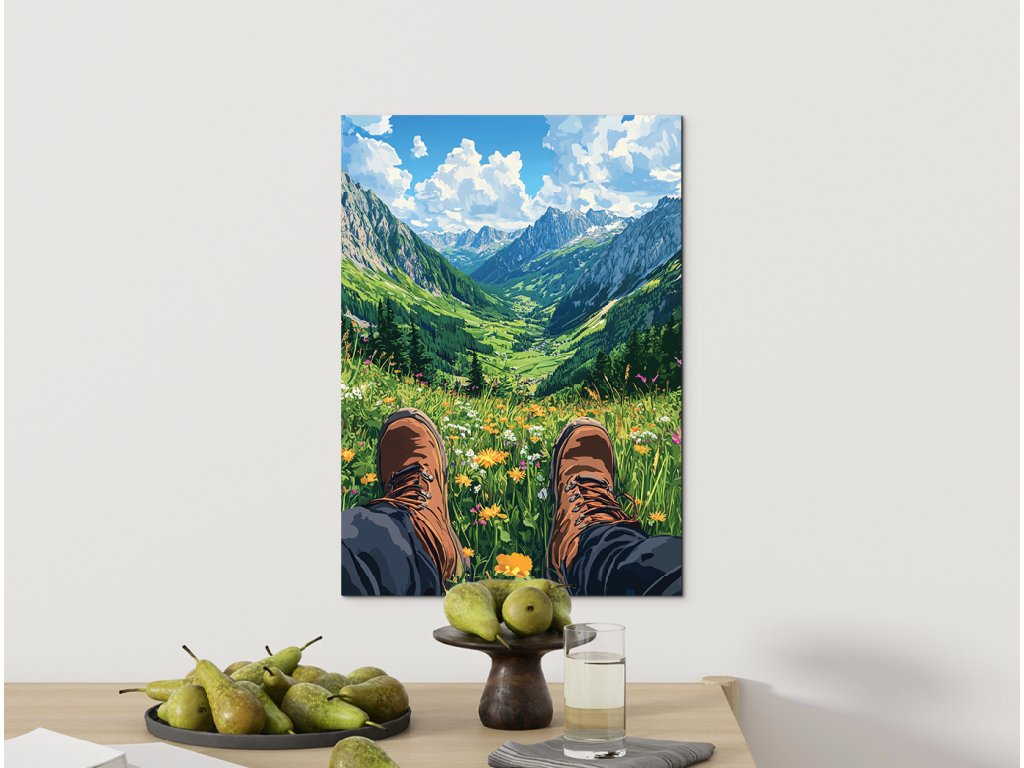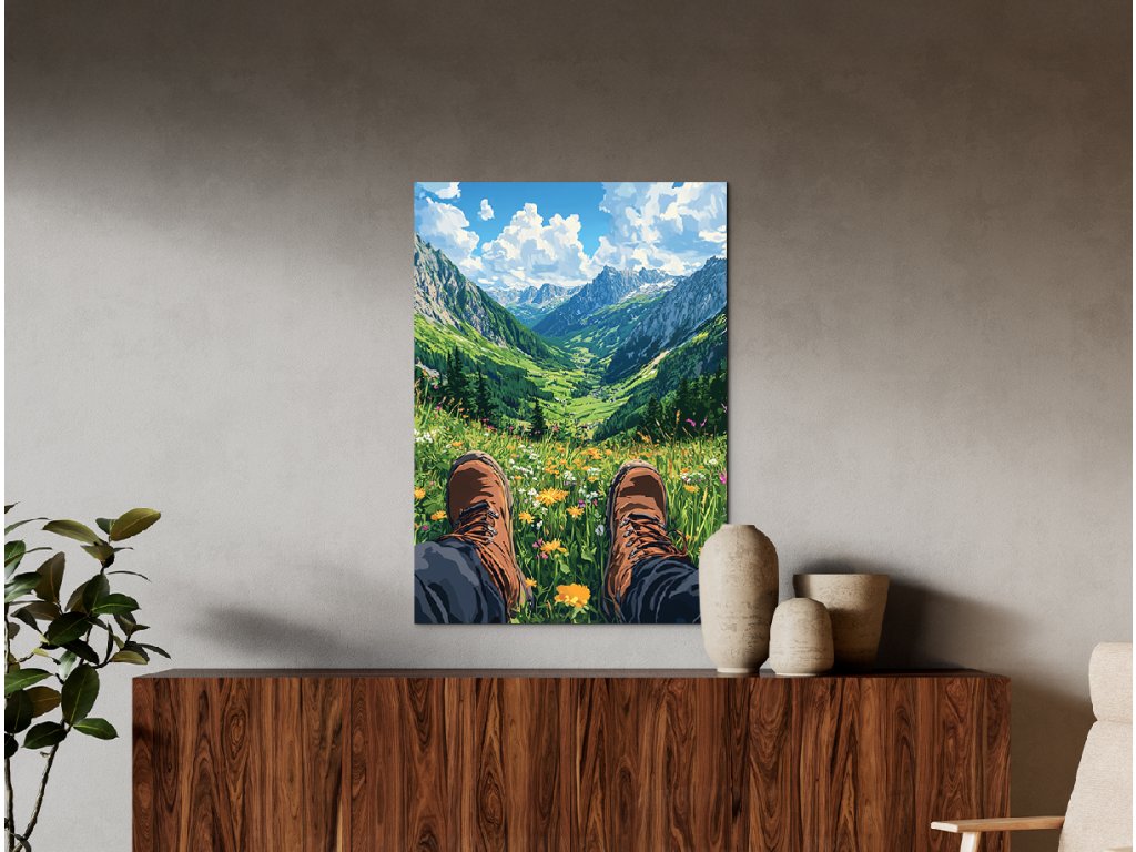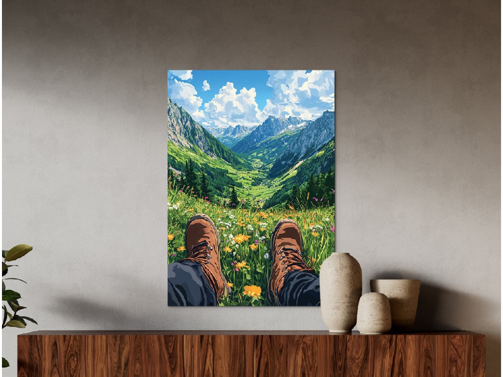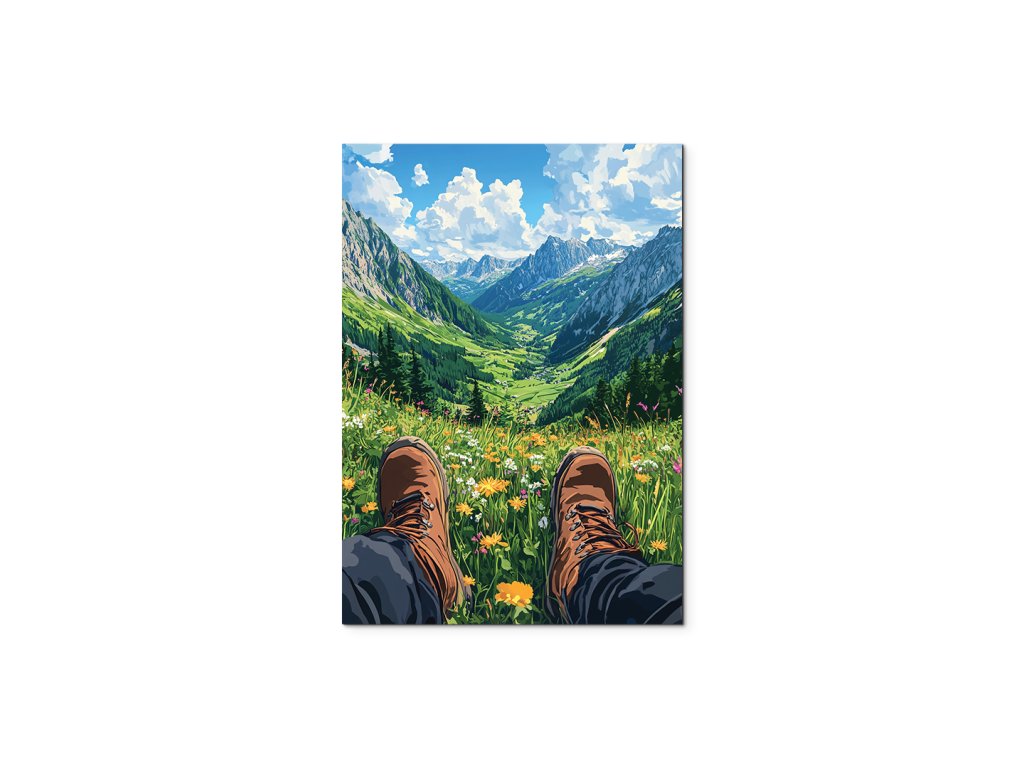 Obrázek zachycuje pohled osoby – nohy v turistických botách spočívají na rozkvetlé louce. Před divákem se otevírá výhled na rozsáhlé horské údolí, zalité světlem. Kompozice evokuje pocit klidu, svobody a propojení s přírodou.