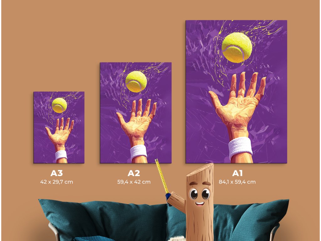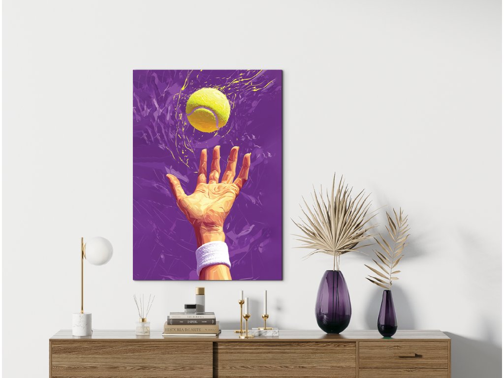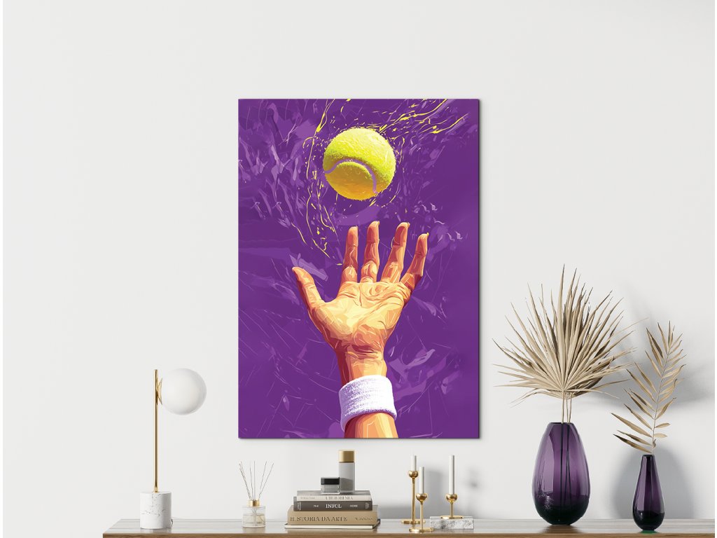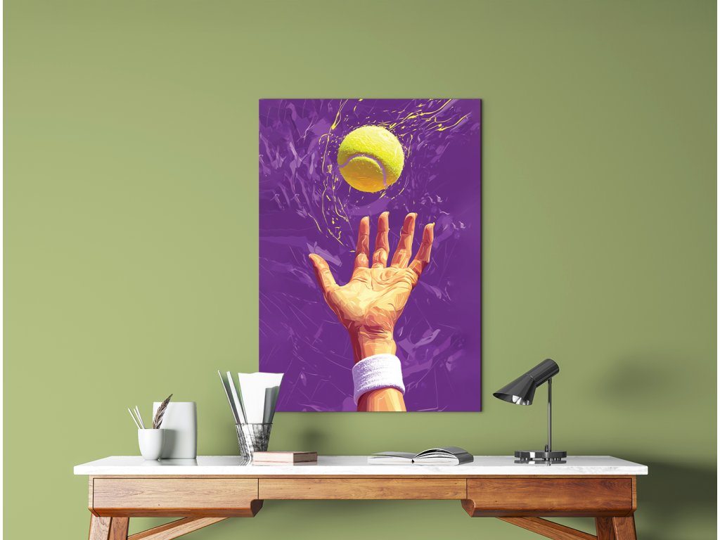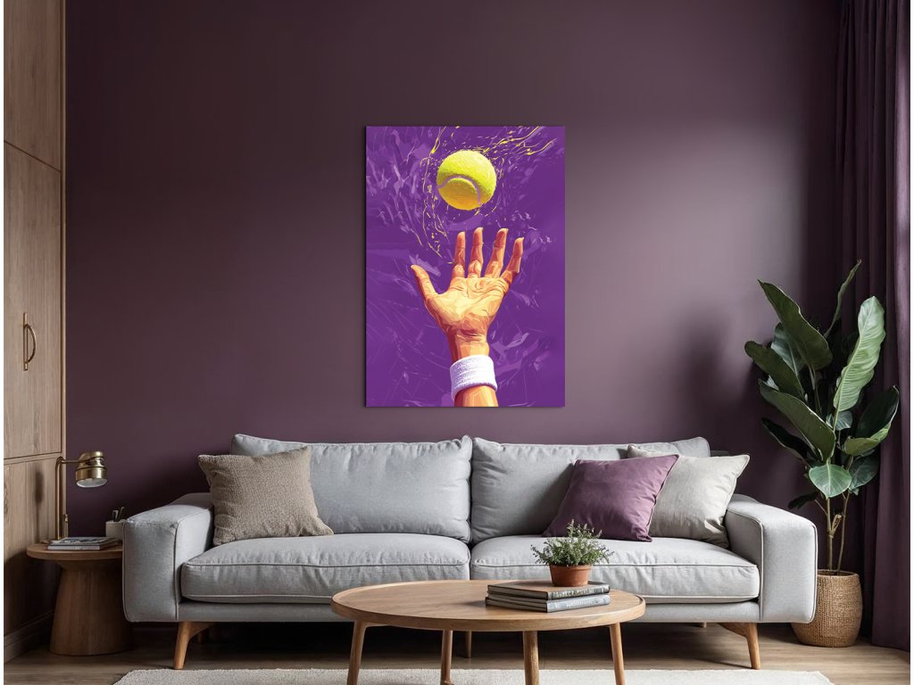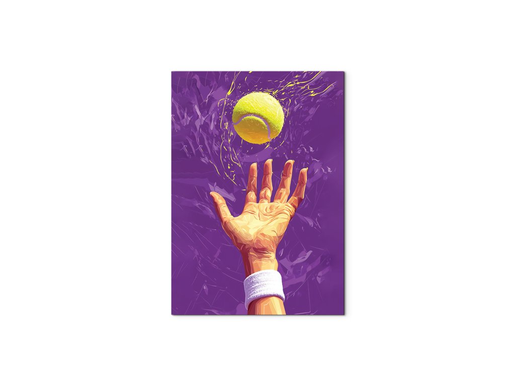 Umělecké zobrazení tenisového podání se zaměřením na okamžik vyhození míčku. Žlutý míč s efektem kontrastuje s fialovým pozadím, čímž obraz vystihuje dynamiku a napětí sportovního momentu.
