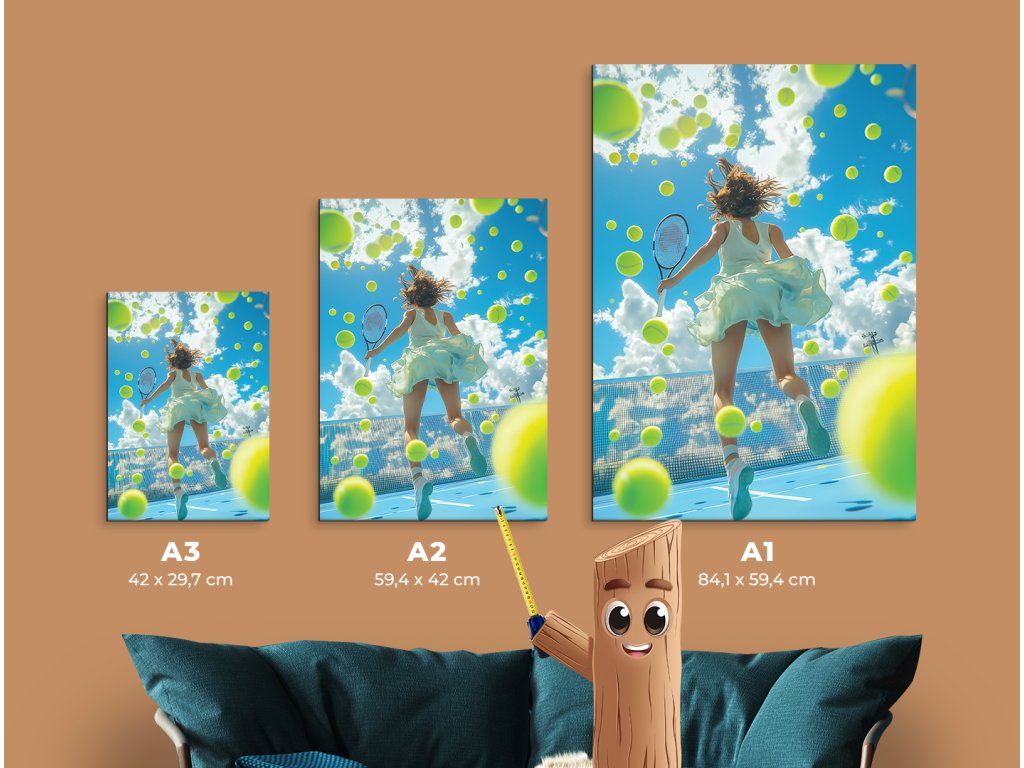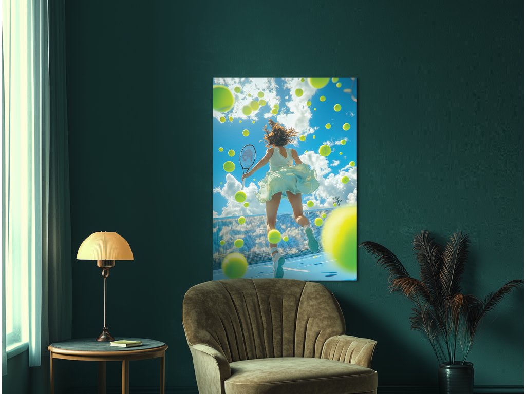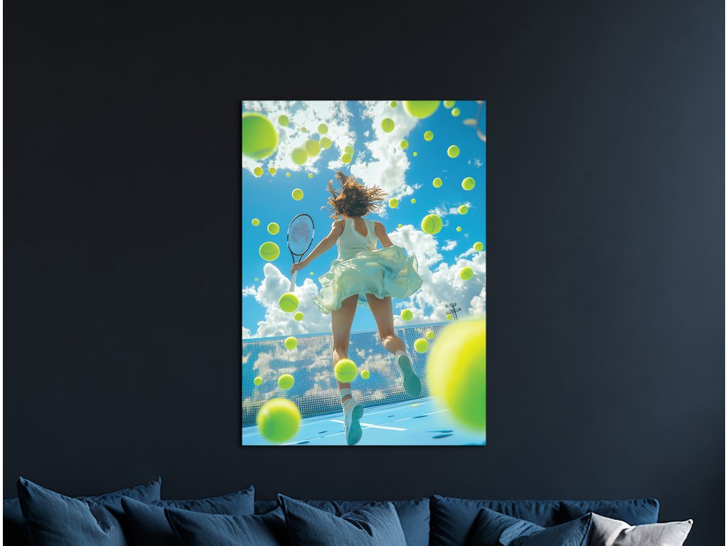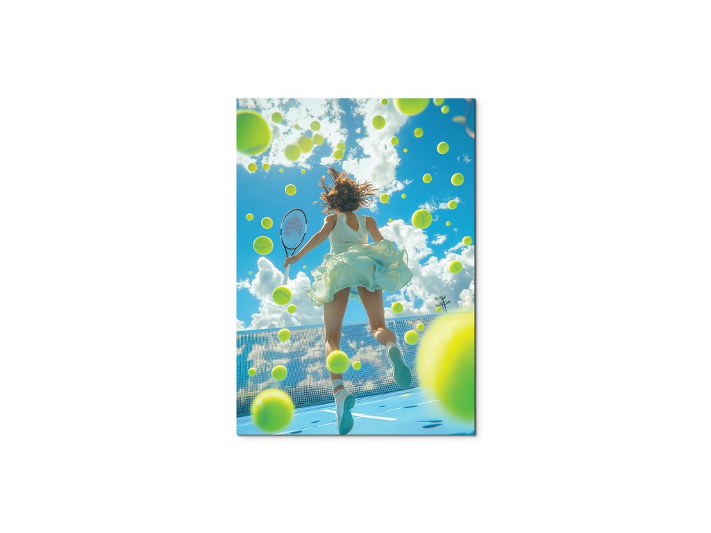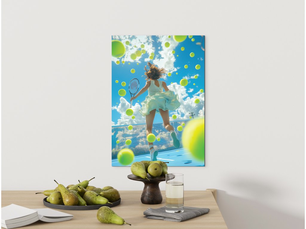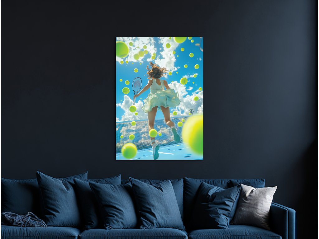Obraz zobrazuje ženskou tenistku v pohybu uprostřed akce na modrém kurtu, s raketou v ruce a míčky letícími vzduchem. Kompozice působí dynamicky a svěže, s živým kontrastem mezi modrou oblohou a kurtem.